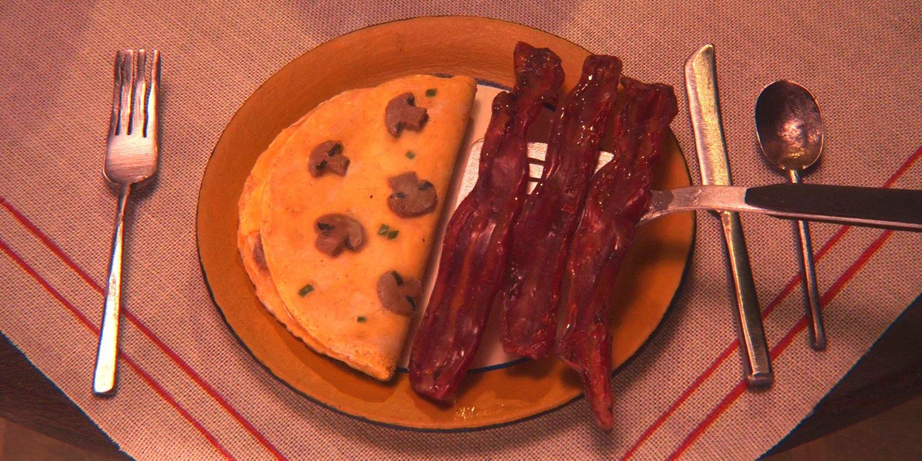 7.Servir el omelette y el tocino en el mismo plato, y opcionalmente agregar más champiñones o cilantro. Servir el licuado, y colocar el pan tostado junto con las mermeladas en la mesa. 6