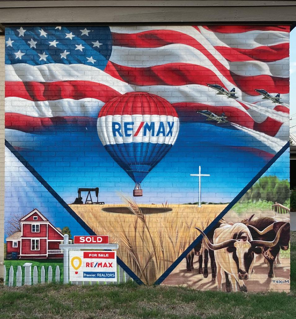 This mural was designed to reflect the spirit of NW Oklahoma, with symbols of our patriotism, local industries, faith, heritage and commitment to helping the community find homes.