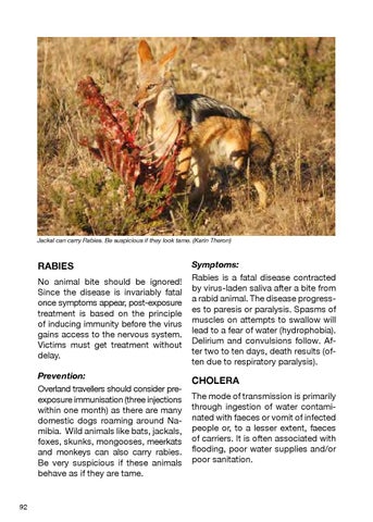 Rabies No animal bite should be ignored! Since the disease is invariably fatal once symptoms appear, post-exposure treatment is based on the principle of inducing immunity before the virus gains access to the nervous system. Victims must get treatment without delay. Prevention: Overland travellers should consider preexposure immunisation (three injections within one month) as there are many domestic dogs roaming around Namibia. Wild animals like bats, jackals, foxes, skunks, mongooses, meerkats and monkeys can also carry rabies. Be very suspicious if these animals behave as if they are tame. 92