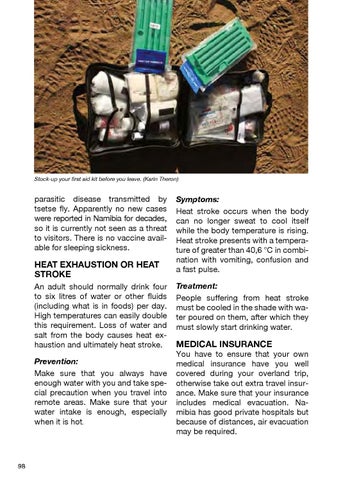 You have to ensure that your own medical insurance have you well covered during your overland trip, otherwise take out extra travel insurance. Make sure that your insurance includes medical evacuation. Namibia has good private hospitals but because of distances, air evacuation may be required.