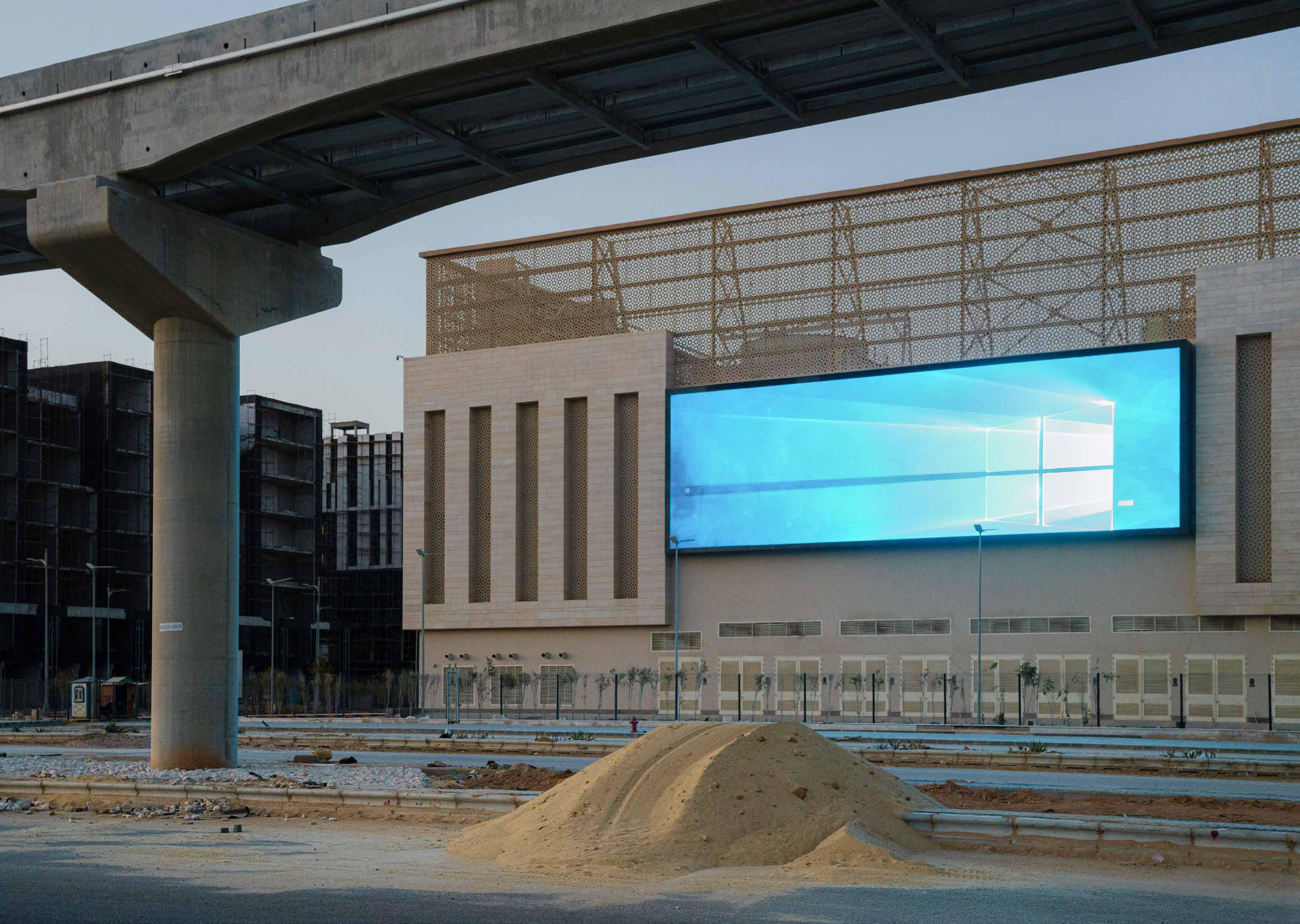 Coolingstation (The screen on a building façade, installed during the initial construction phase. In a later visit, a slideshow of selfies of the builders, promotional videos, and pictures of the president in military salute is displayed.)