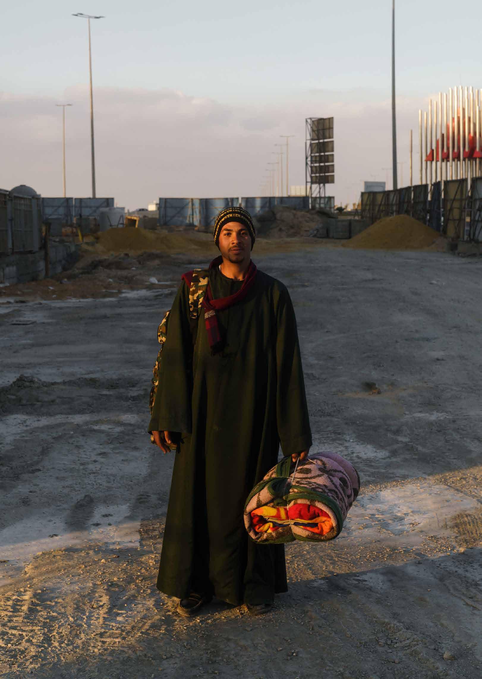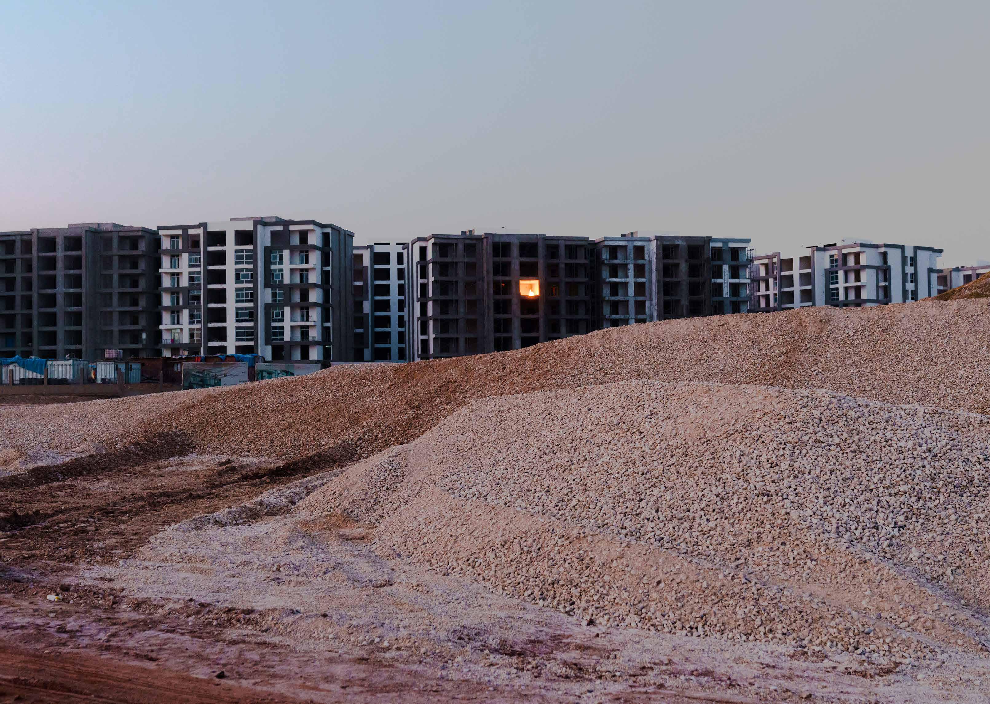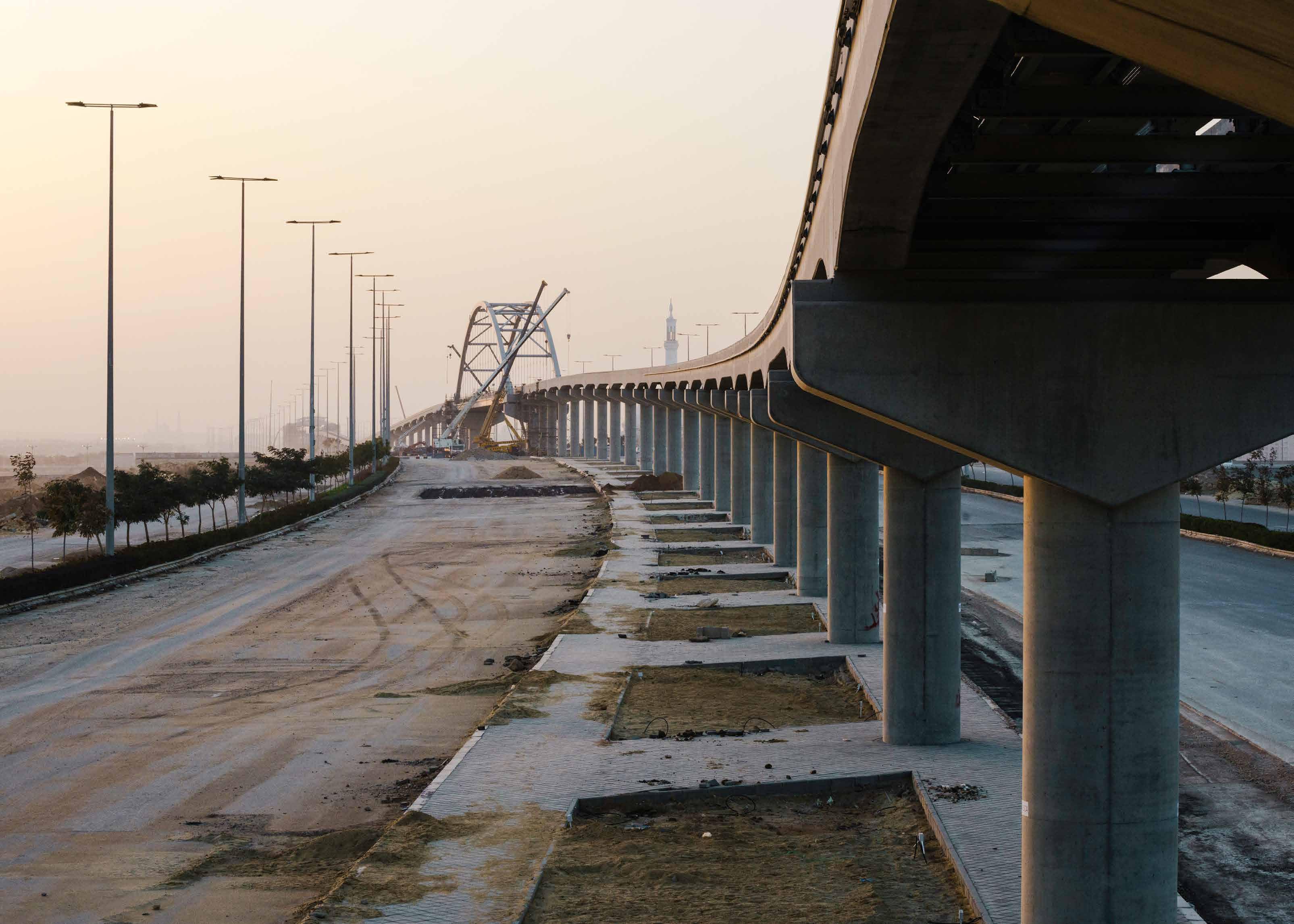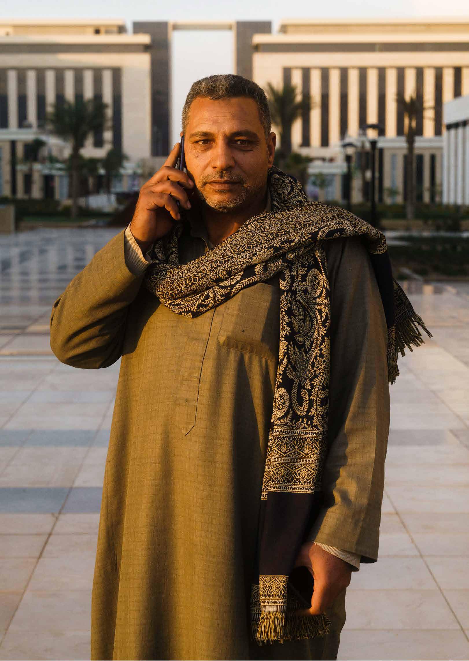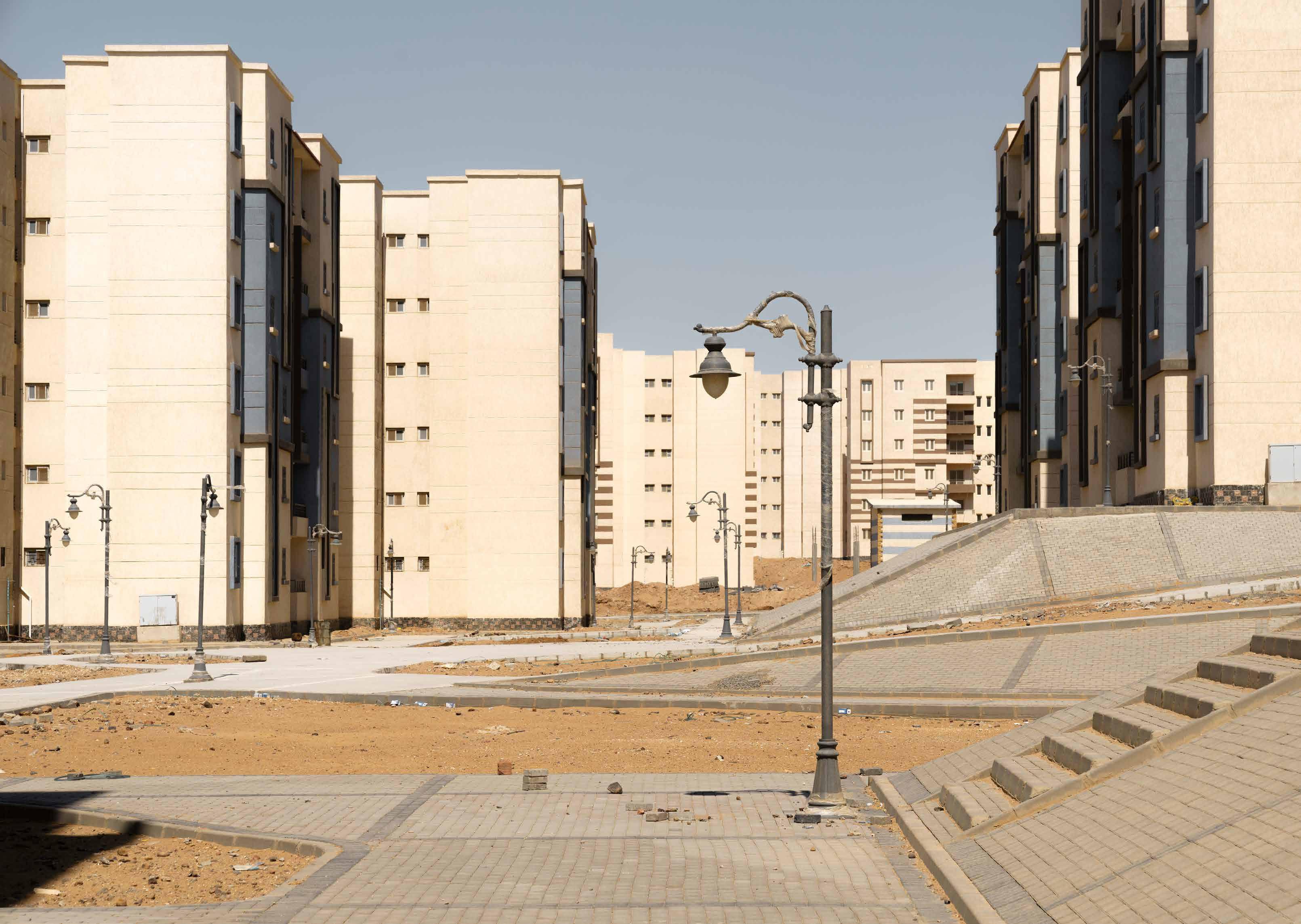 Egyptian. As billboards showcasing the opulence of an unrecognizable occidental life continue to multiply along the antiquated highways of its existing cities, Egypt’s political elite continue to weave their laurels in the sand; and with only a costly high-speed train fissuring the cottonmouthed from the gluttonous, the cracks in the country’s social infrastructure continue to grow. These juxtapositions are manifest in Roth’s prudent portrayal of the country’s latest ghost town to be and highlighted in his contrasting representation of callous landscapes and parabolic portraits. Through the utilization of natural light, he produces polished aesthetics akin to those used to market the New Administrative Capital, exercising a radical mimicry throughout the work. During his visits, he was as unfamiliar as the concrete and steel are to the dunes on which they lie, his presence among the towering structures indiscreet. Having gained unprecedented access to the half-built city, Roth navigated the inherent kindness and hospitality as well as the systematic exaltation of Western visitors (ueqdet al khawaga/عقدة الخواجة) embedded within Egyptian culture. After several failed attempts at obtaining a photography permit by government fiat, Roth eventually spent two nights detained by Egyptian authorities after exploring the vacant cityscape of Cairo’s heir presumptive disguised as a visiting architecture student or, at times, curious financier; the penance imposed by an increasingly paranoid state. His imagery captures the tension between the nation’s fears of embalming a rotten past and its hopes to build an emblematic future. Why do we build? And paramount to this, who do we build for? These are the questions the Egyptian gaovernment has historically failed to ask itself and the ones Roth beckons his audience to consider. Fata Morgana, like others before it, ultimately traverses a land that has witnessed Ozymandias-like figures in abundance, but whether this new venture serves the Egyptian people as an honorable heirloom or another colossal wreck remains to be seen.