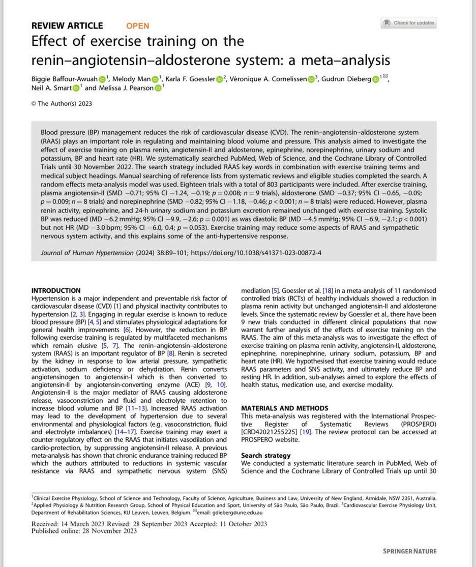 Este metaanálisis investigó de 18 ensayos clinicos aleatorizados con 803 personas; el efecto del entrenamiento físico sobre niveles plasmáticos de renina, angiotensina II, aldosterona, epinefrina, norepinefrina, sodio y potasio urinarios, la presión Arterial (PA) y la frecuencia cardíaca (FC).