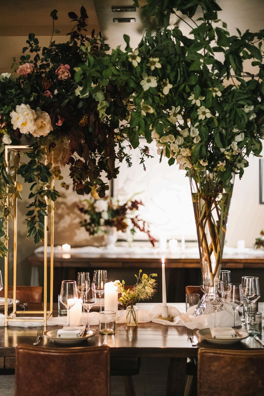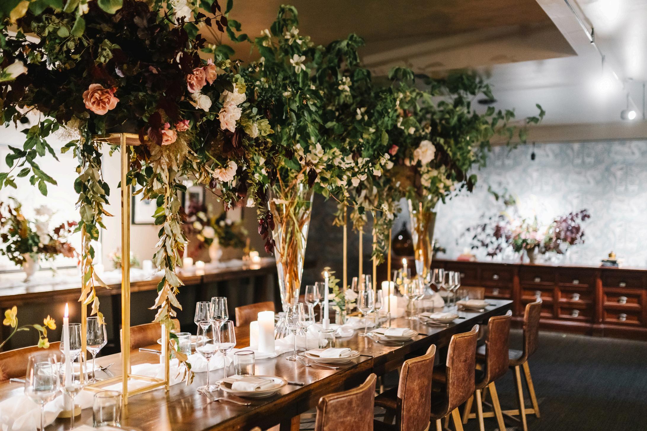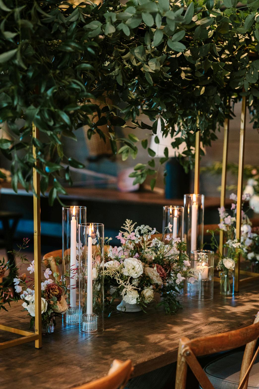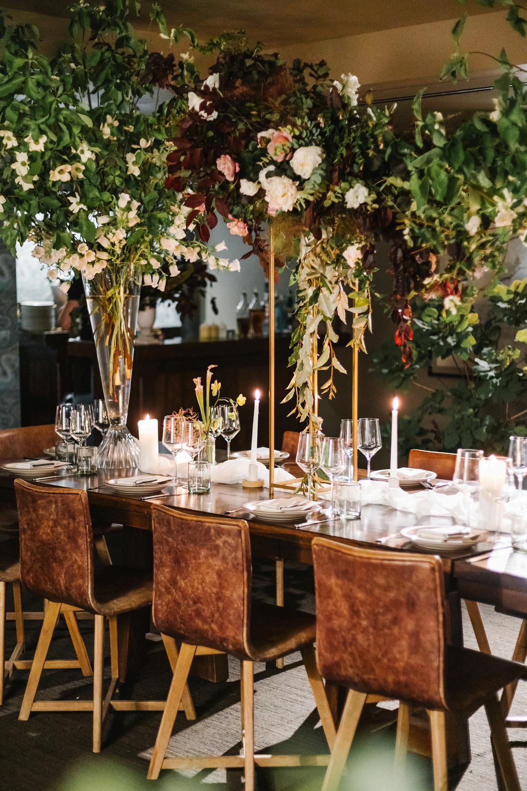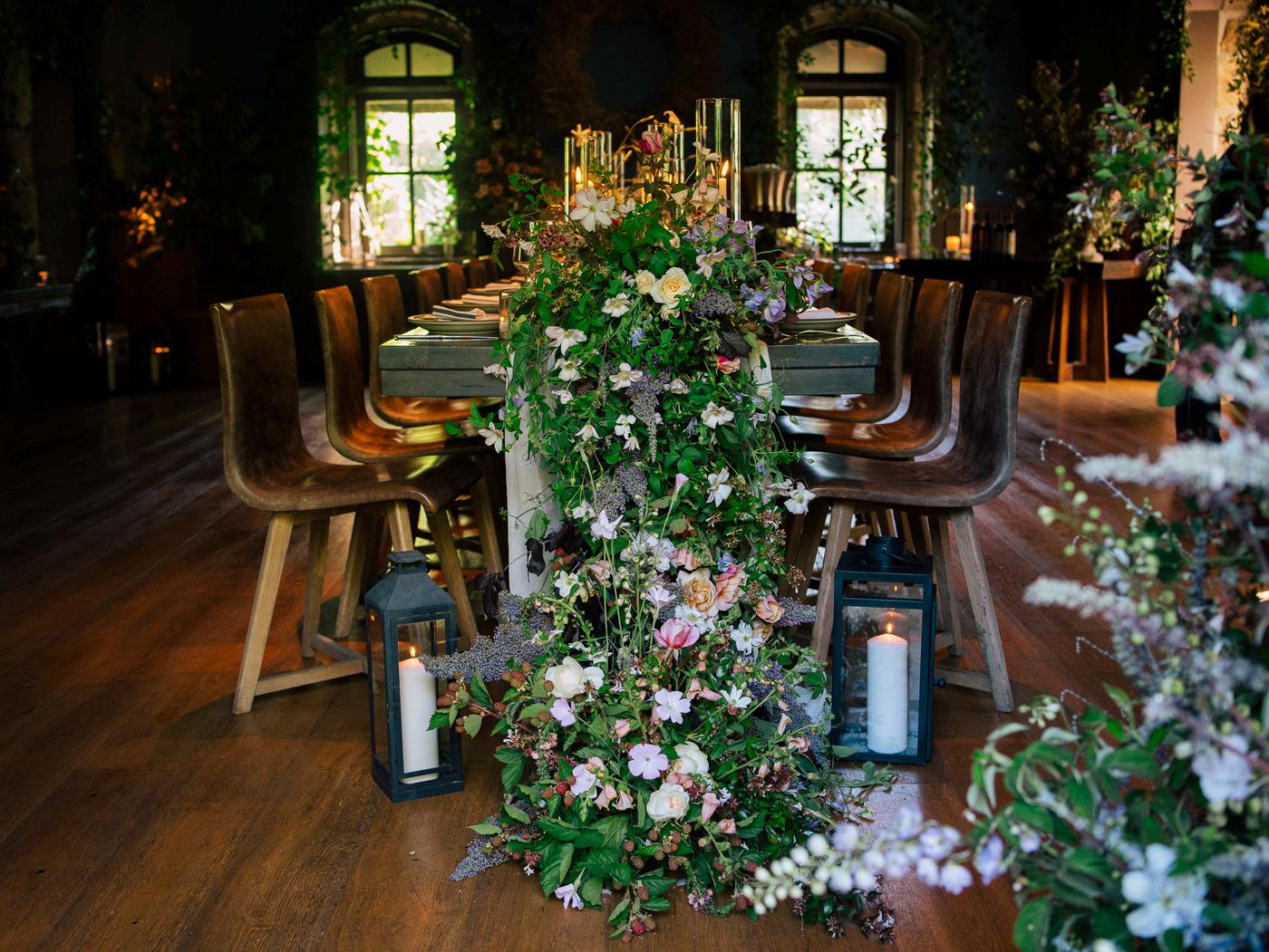 Cascading tablescape design to create a dramatic flow of vines and flowers