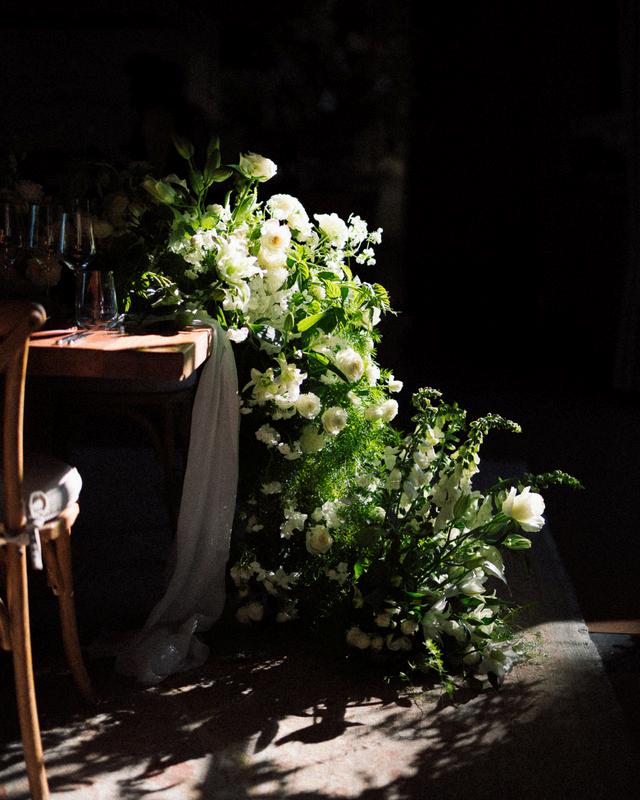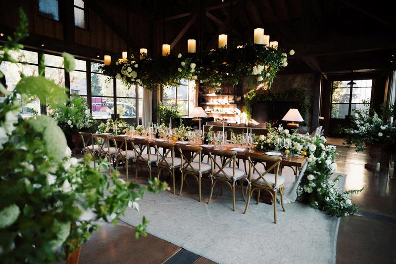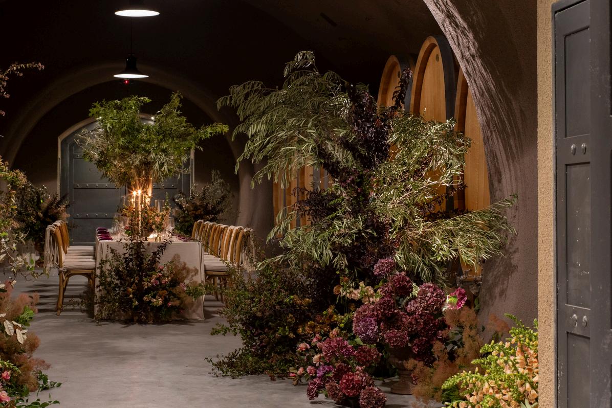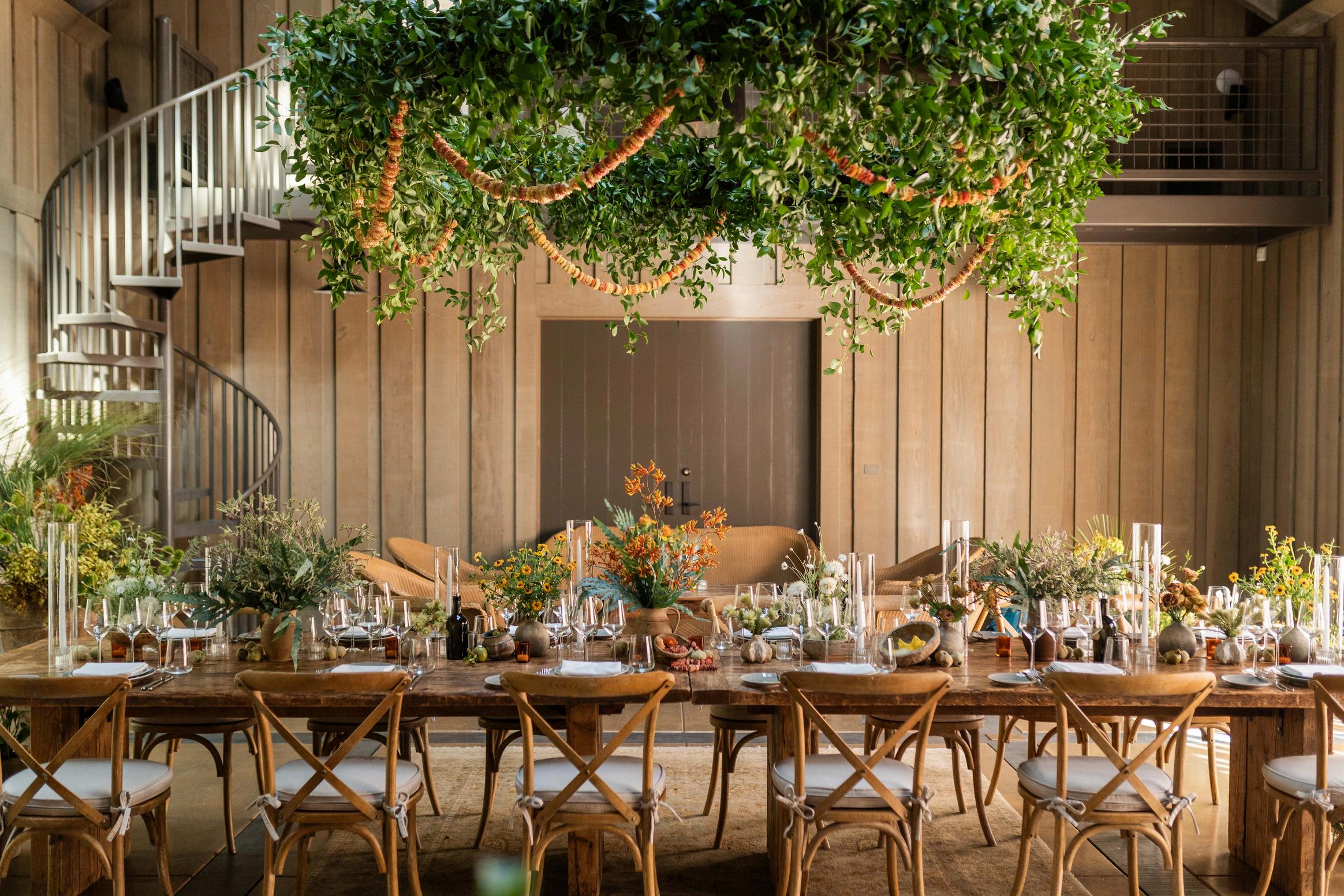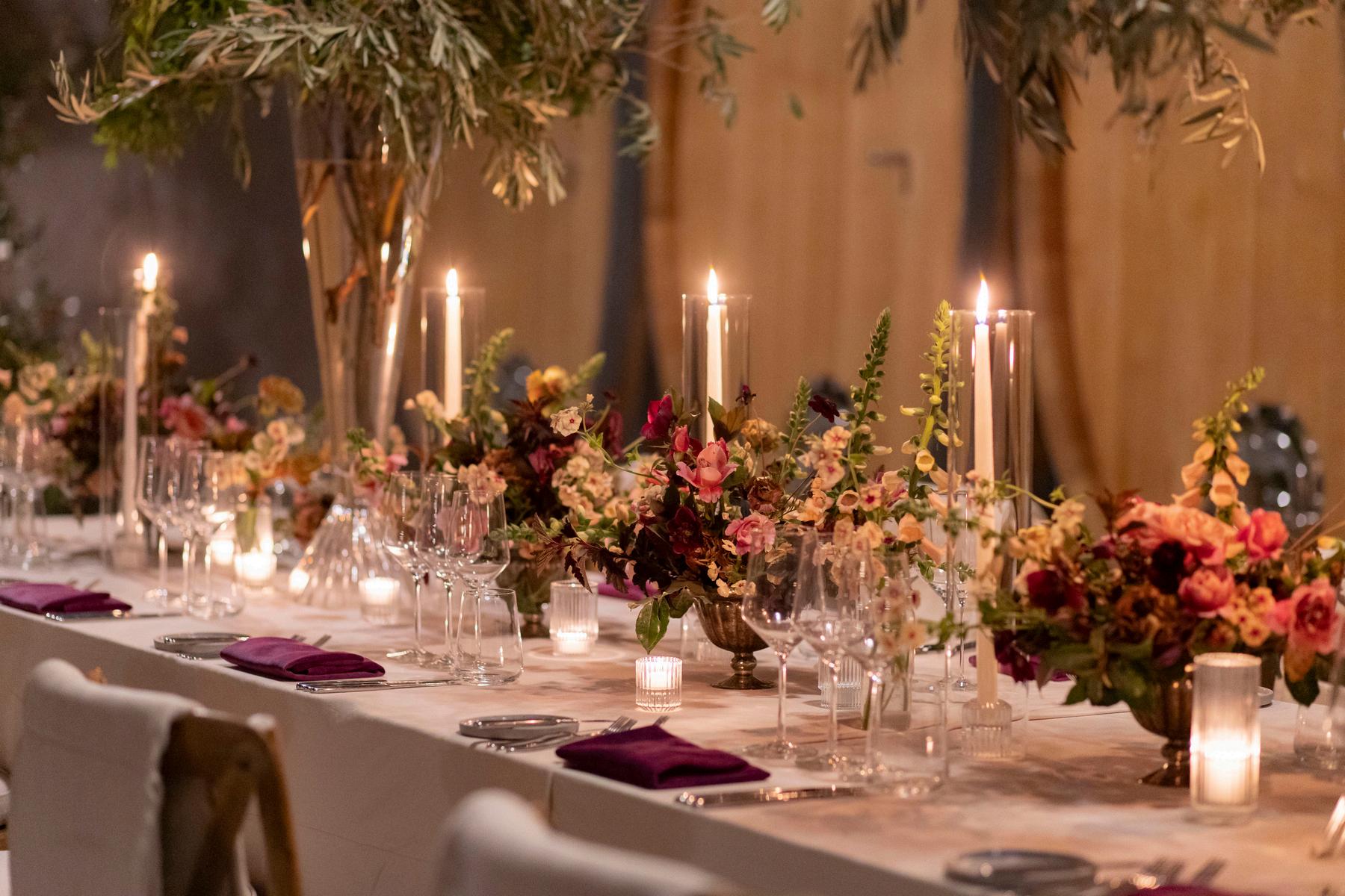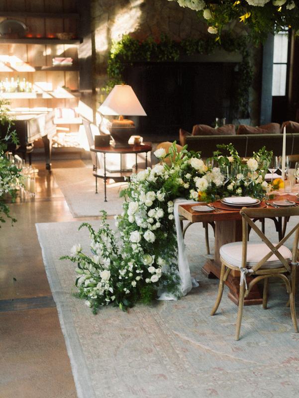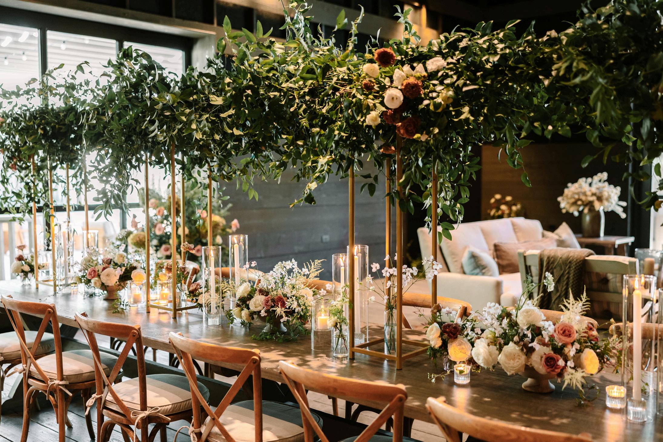 Cascading tablescape design to create a dramatic flow of vines and flowers