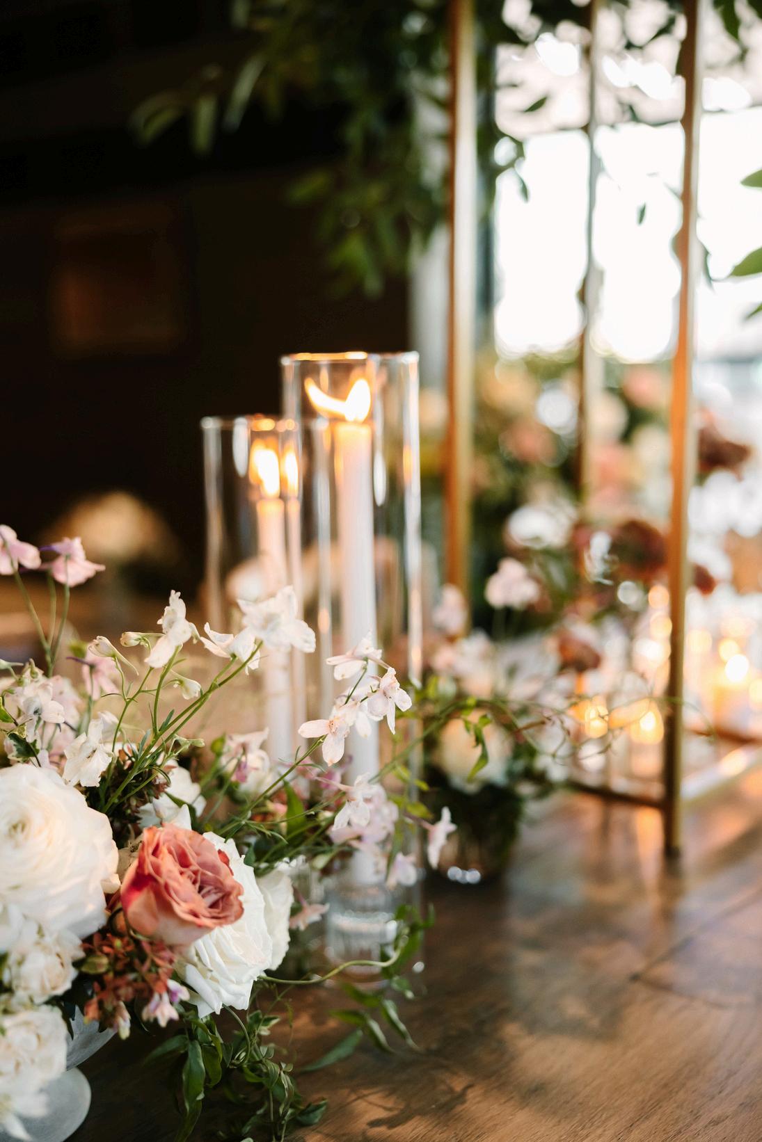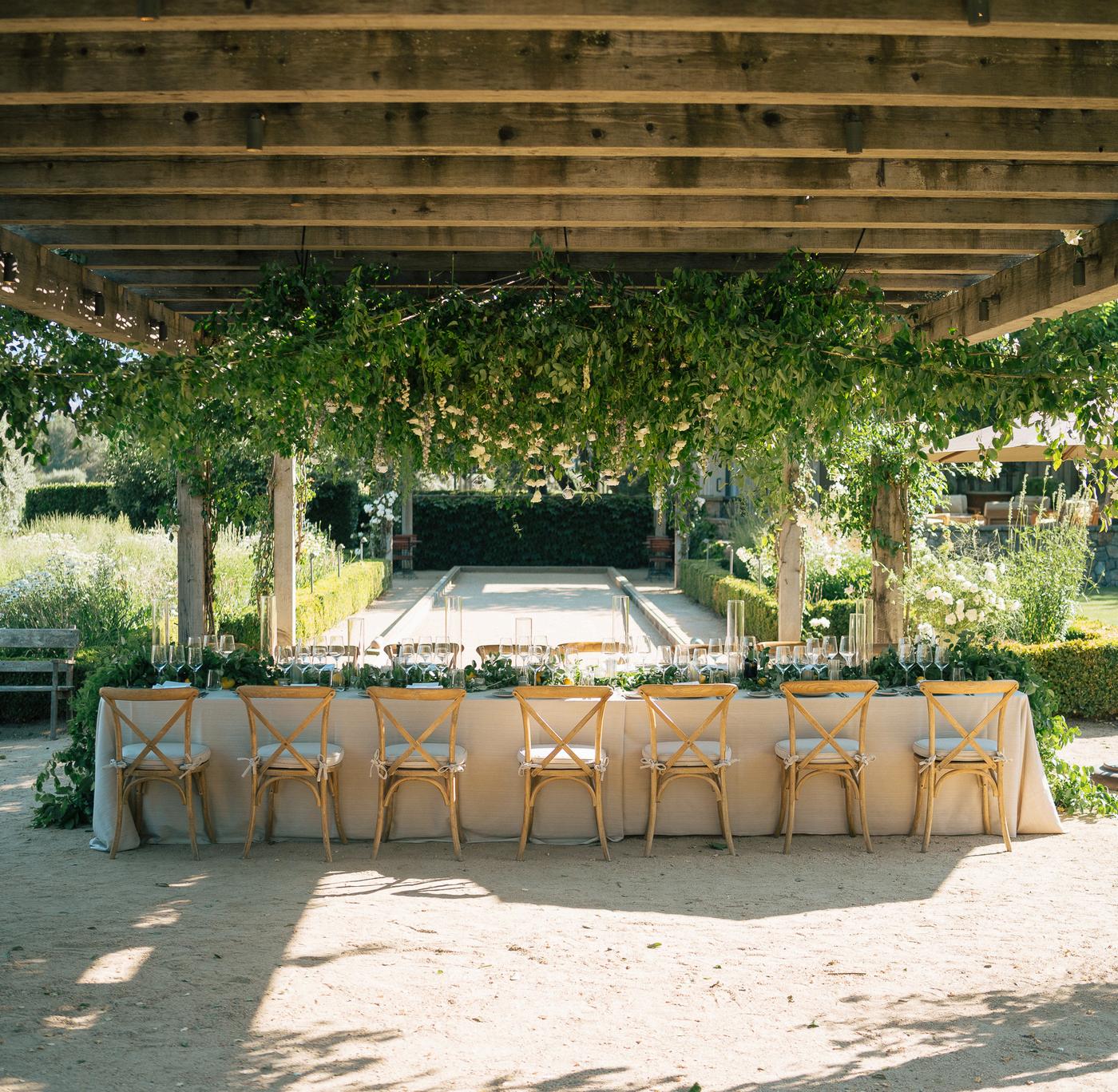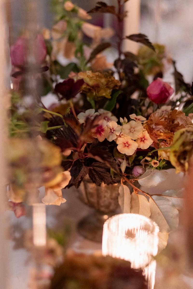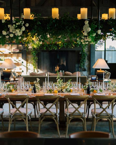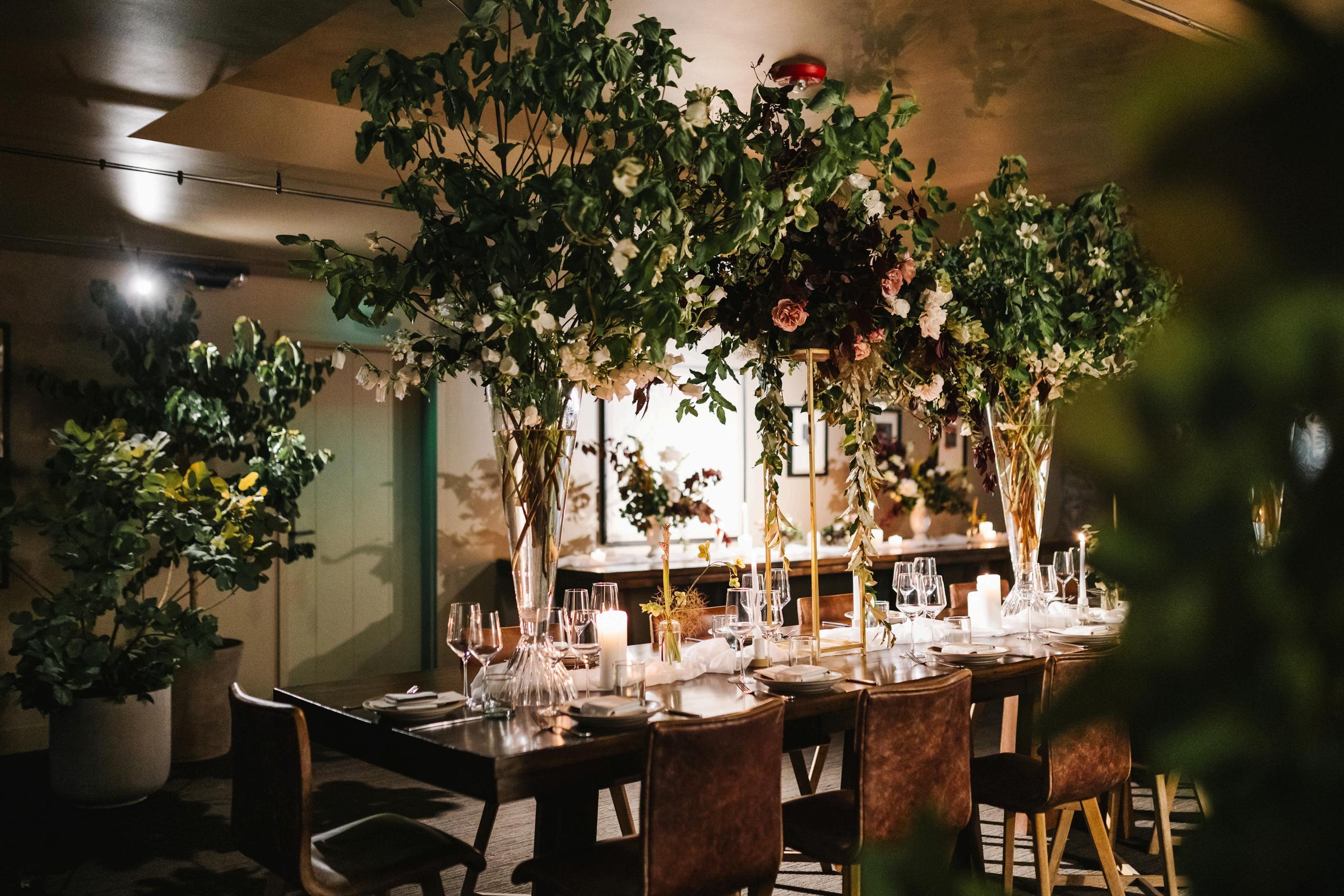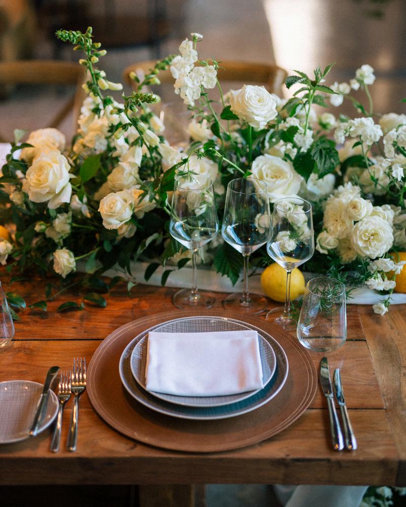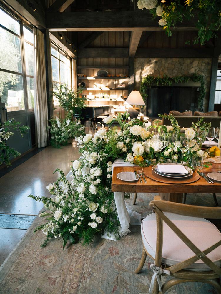 Cascading tablescape design to create a dramatic flow of vines and flowers
