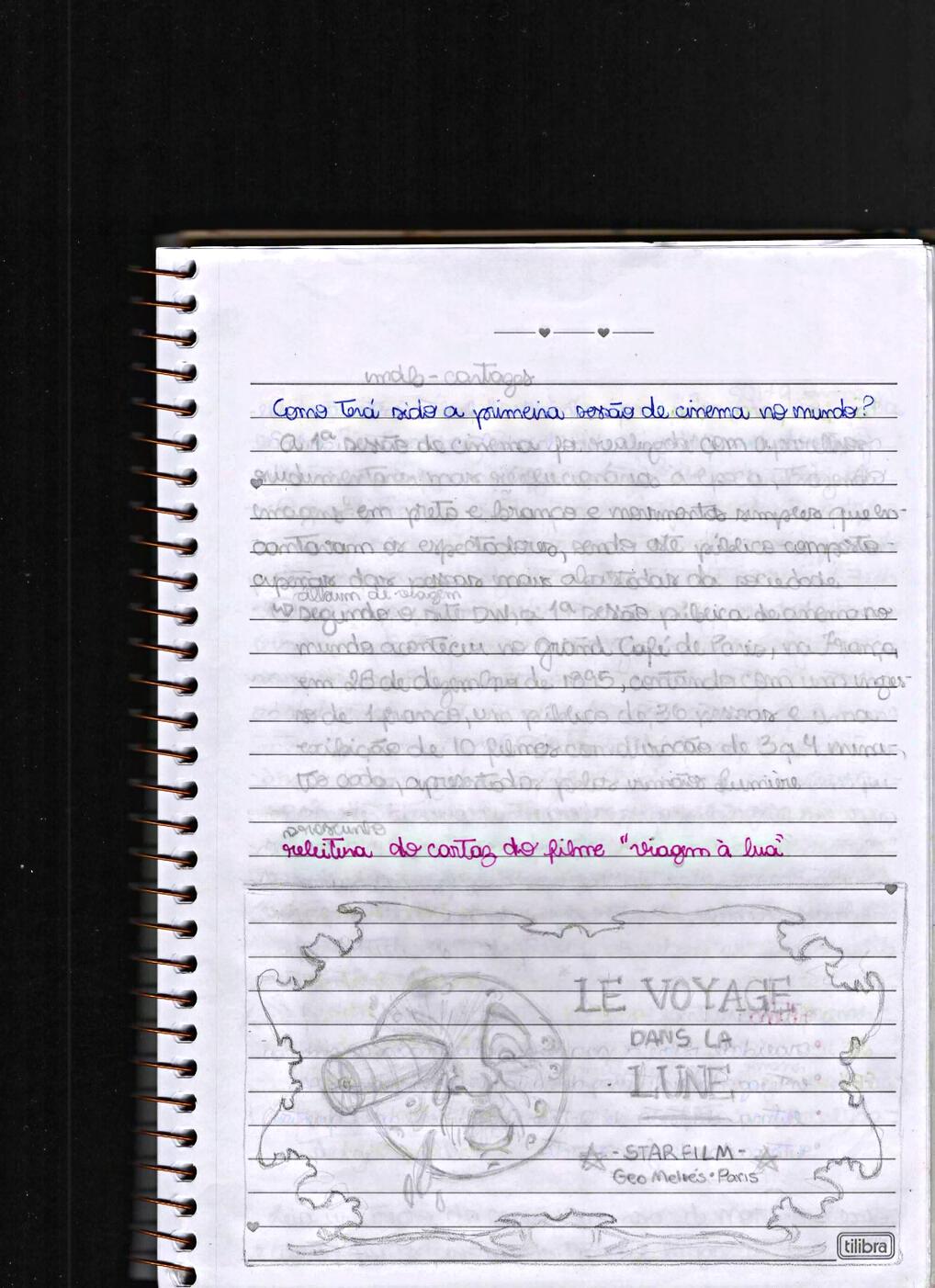 Terminadaatrocaderespostas,passamos a analisar alguns cartazes do curtametragem “Viagem à Lua”, para que nos inspirássemos e então realizássemos um rascunhodereleituradoscartazesnotempode 20 minutos. Em seguida, realizamos uma apreciação do filme de Georges Méliès, compartilhamos nossos entendimentos em uma discussão mediada pela professora, e então iniciamos a correção da lista de exercíciossolicitadanaaulapassada.