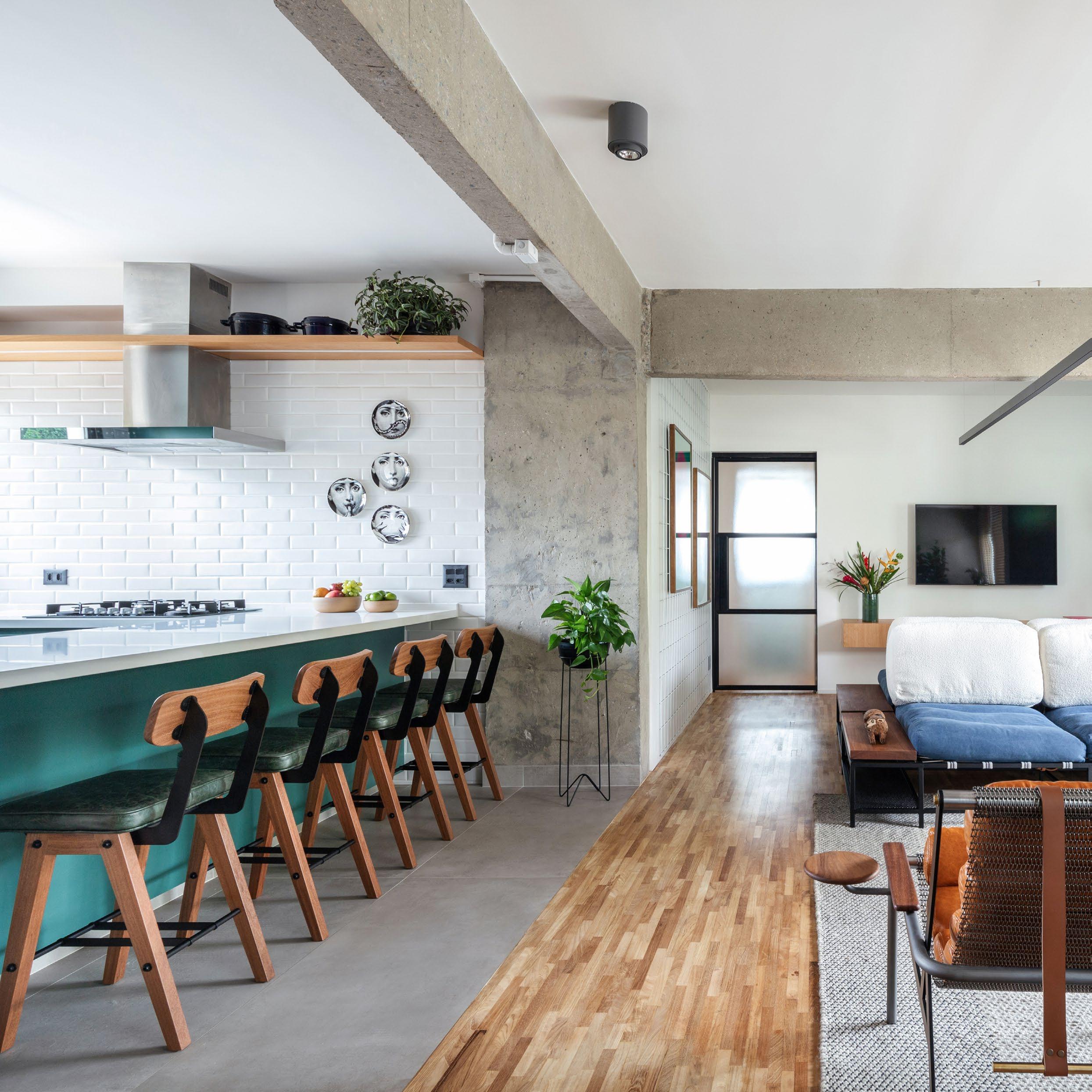 A parte que mais chama atenção no projeto, é a sala integrada com a cozinha, com vigas e pilares aparentes de forte presença, além de uma cozinha moderna em um tom de verde vivo. Um móvel que chamamos de multiuso também fez a função de integrar sala, cozinha e área de serviço: na sala é um painel ripado com nichos decorativos; na cozinha é o local de bar e adega, além de alocar a geladeira; e na área de serviço serve como despensa.