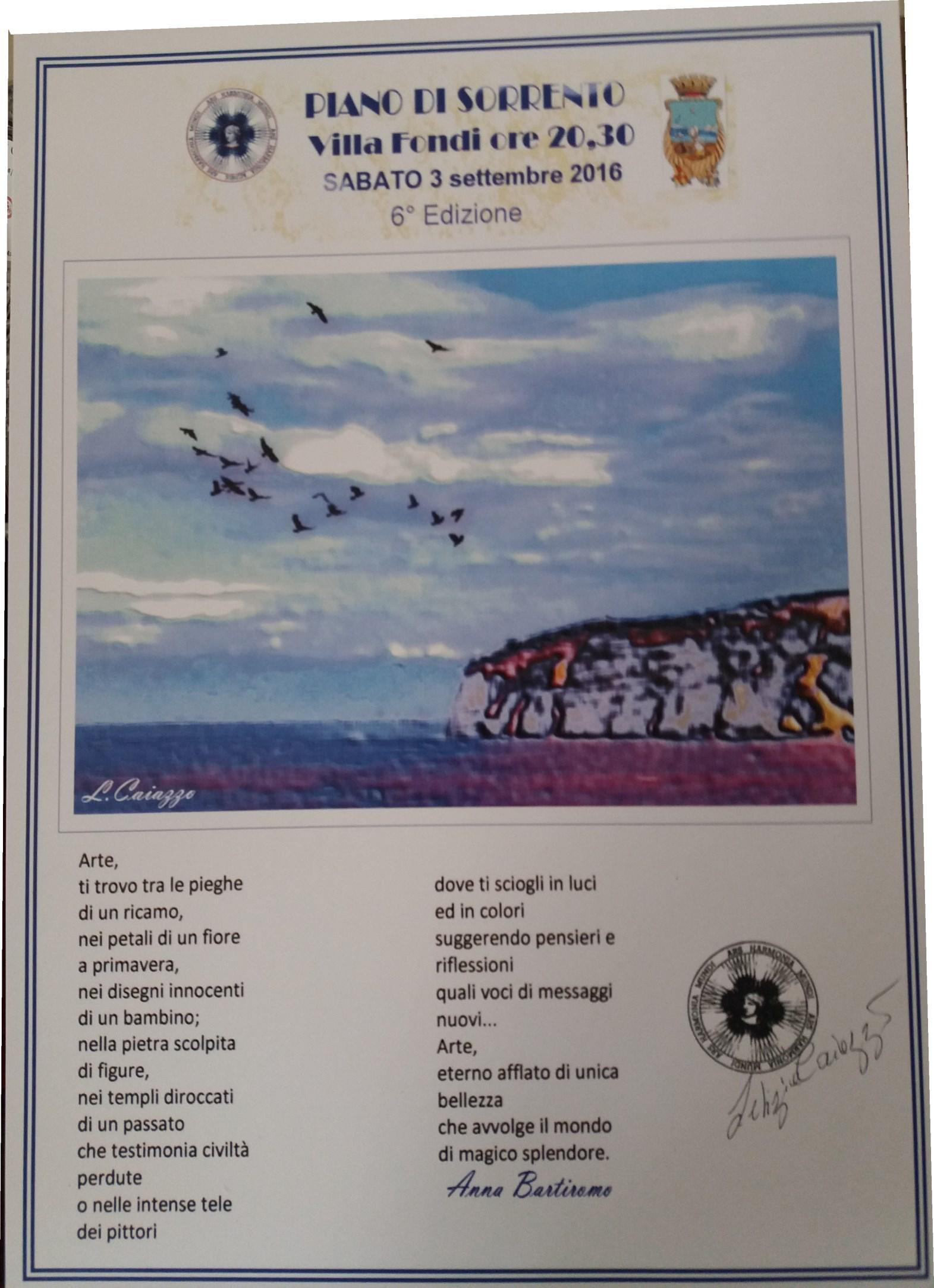 Naturalmente senza il patrocinio della Città di Piano di Sorrento, ,senza gli artisti tutti che hanno avuto fiducia in me e a tutti coloro che hanno contribuito negli anni alla realizzazione di questo evento e senza la partecipazione del pubblico che da sempre e sempre più numeroso segue con interesse e piacere, da sola non sarei potuta arrivare fin qui. Credo fermamente nella cooperazione, nel lavorare in sinergia ed armonia, aiutandoci l’un con l’altro senza rivalità e mania di protagonismo, solo così si arriva all’obiettivo prefissato riscuotendo tutti insieme plauso e ammirazione.