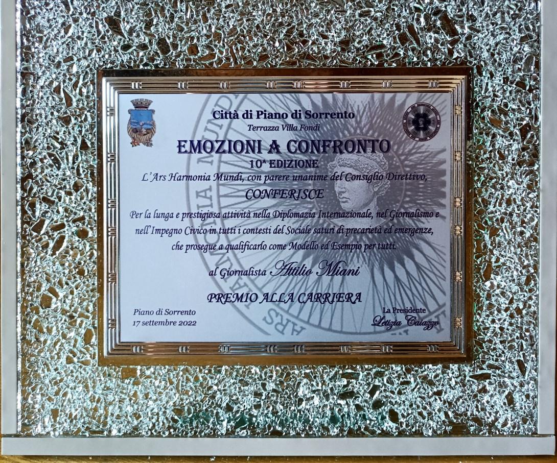 “ Emozioni a confronto “ giunge alla decima edizione. Un traguardo importante, un impegno di fedeltà, lievito e semi gettati, per la vita culturale della nostra città. Le idee camminano sulle gambe degli uomini. A Piano di Sorrento abbiamo avuto il dono ed il privilegio di incrociare le nostre storie personali e collettive, con una donna di profonda cultura e di contagiosa capacità di bellezza. Parlo dell’amica Letizia Caiazzo, straordinario esempio di amore per la nostra città e dell’arte, declinata in tutte le sue forme. Pittura, poesia,musica, danza trovano “ accoglienza “ è casa in tutte le iniziative organizzate. Assicuro e rinnovo,la piena e totale disponibilità dell’amministrazione comunale a sostenere e promuovere le iniziative della nostra Letizia. Un ringraziamento speciale a tutti coloro che collaborano a rendere speciali questi eventi.
