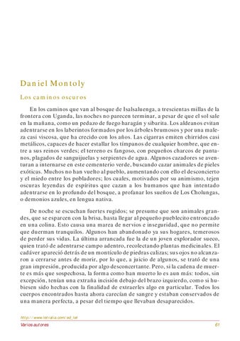 Daniel Montoly Los caminos oscuros En los caminos que van al bosque de Isalsaluenga, a trescientas millas de la frontera con Uganda, las noches no parecen terminar, a pesar de que el sol sale en la mañana, como un pedazo de fuego haragán y sibarita. Los aldeanos evitan adentrarse en los laberintos formados por los árboles brumosos y por una maleza casi viscosa, que ha crecido con los años. Las cigarras emiten chirridos casi metálicos, capaces de hacer estallar los tímpanos de cualquier hombre, que entre a sus reinos verdes; el terreno es fangoso, con pequeños charcos de pantanos, plagados de sanguijuelas y serpientes de agua. Algunos cazadores se aventuran a internarse en este cementerio verde, buscando cazar animales de pieles exóticas. Muchos no han vuelto al pueblo, aumentando con ello el desconcierto y el miedo entre los pobladores; los cuales, motivados por su animismo, tejen oscuras leyendas de espíritus que cazan a los humanos que han intentado adentrarse en lo profundo del bosque, a profanar los sueños de Los Cholungas, o demonios azules, en lengua nativa. De noche se escuchan fuertes rugidos; se presume que son animales grandes, que se esparcen con la brisa, hasta llegar al pequeño pueblecito entroncado en una colina. Esto causa una marea de nervios e inseguridad, que no permite que duerman tranquilos. Algunos han abandonado ya sus hogares, temerosos de perder sus vidas. La última arrancada fue la de un joven explorador sueco, quien trató de adentrarse campo adentro, recolectando plantas medicinales. El cadáver apareció detrás de un montículo de piedras calizas; sus ojos no alcanzaron a cerrarse antes de morir, por lo que, a juicio de algunos, se trató de una gran impresión, producida por algo desconcertante. Pero, si la cadena de muerte es más que sospechosa, la forma como han muerto lo es aun más: todos, sin excepción, tenían una extraña incisión debajo del brazo izquierdo, como si hubiesen sido hechas con la finalidad de extraerles algo en particular. Todos los cuerpos encontrados hasta ahora carecían de sangre y estaban conservados de una manera perfecta, a pesar del tiempo que llevaban desaparecidos. http://www.letralia.com/ed_let