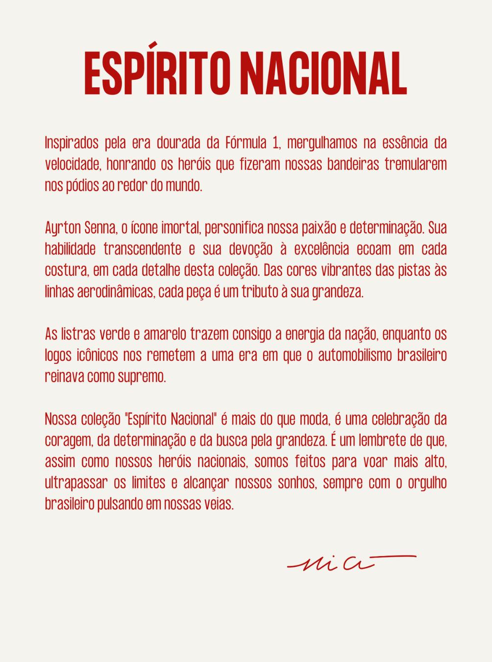 O Espírito Nacional é o cerne não apenas de uma coleção, mas de um movimento que nasce primordialmente em 1960 e mantém seu legado vivo até hoje: a presença de um ícone nacional como Ayrton Senna nos autódromos do mundo inteiro, conquistando a nação com seu carisma, força e persistência. E mesmo após seu falecimento, é inegável que Senna mantém vivo no brasileiro o espírito nacional, de que o brasileiro é muito mais do que o mundo pode esperar dele, seja dentro de um carro de corrida, ou no que quer que se proponha a fazer.