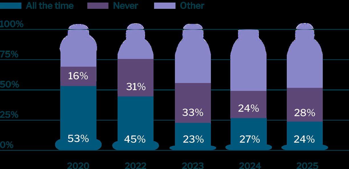 Similar to the 2024 Sex Lives Report data, 69% of sexually active Canadian youth reported never or inconsistently using condoms, with 1 in 4 youth (26%) never using a condom, a slight increase from 21% or 1 in 5 in 2024.