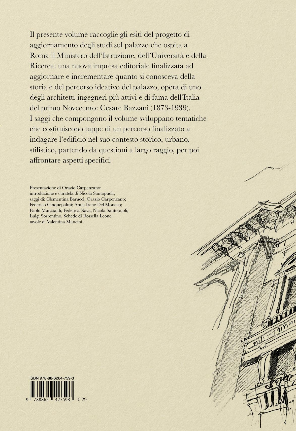 3. Va sottolineato che per il Palazzo del Ministero della Pubblica Istruzione, grazie al contributo del MIUR (si veda nota 1 di pag…), sono state finanziate varie borse di collaborazione che han no portato al coinvolgimento di giovani architetti, in particolare: l’arch. Paolo Marcoaldi per l’or ganizzazione della documentazione d’archivio e il ridisegno di opere con riferimento ad architetti del primo Novecento a Roma; l’arch. Gabriele Tedesco per la ricerca storico-archivistica sul can tiere di costruzione del Palazzo del MIUR, opera di Cesare Bazzani, con specifico riferimento al les sico ed allo studio dei cementi decorativi; l’arch. Rossella Leone per la ricerca relativa ai materiali e alle tecniche costruttive delle opere architettoni che di Bazzani; l’arch. Valentina Mancini per l’or ganizzazione della documentazione grafica d’ar chivio e il ridisegno degli elaborati grafici relativi al palazzo del MIUR (piante, sezioni, sezioni-pro spetti, prospettive, assonometrie e particolari); l’arch. Riccardo Bulzoni che ha curato il regesto della documentazione sul palazzo, conservata nell’Archivio di Stato di Roma, e ha intrapreso il ridisegno di alcuni elaborati di Bazzani. Inoltre, va precisato che le ricerche degli architetti Tede sco, Leone e Mancini sono state coordinate dal Prof. Antonio Russo. Infine, grazie alla collabo razione tra il MIUR e la Facoltà di Architettura, è stato possibile sviluppare sul Palazzo del MIUR due tesi magistrali in Architettura UE, discusse nell’a.a. 2019-2020, dal titolo: 1) Il Palazzo del Ministero della Pubblica Istruzione: dalla ricerca storica al progetto di valorizzazione (relatori Prof. N. Santopuoli, Prof. O. Carpenzano; correlatore arch. G. Tedesco; laureanda Valentina Mancini); 2) Riqualificazione energetica di un edificio mi nisteriale (relatore Prof. F. Mancini; correlatore Prof. N. Santopuoli; laureanda Iris Jaupi).