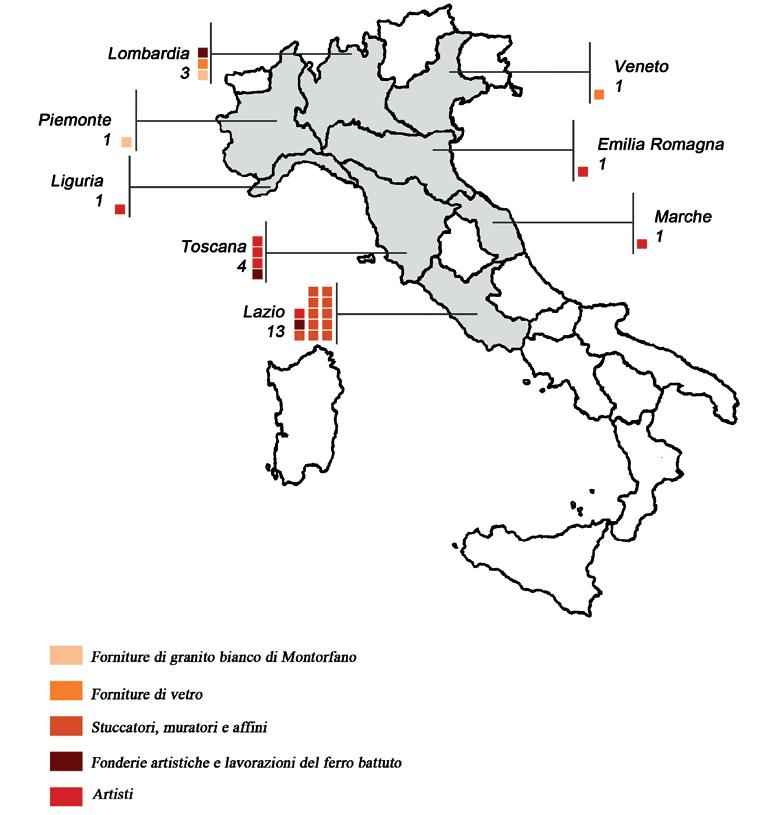 Distribuzione geografica e tipologia delle ditte e delle maestranze coinvolte nella costruzione del palazzo del Ministero della Pubblica Istruzione (R. Leone).