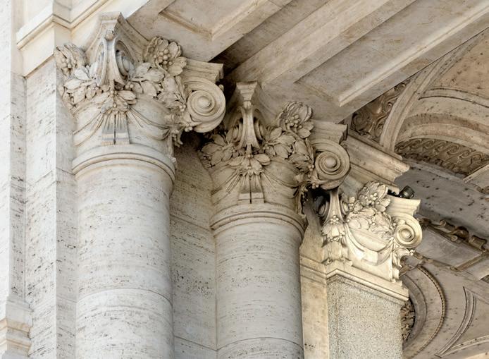 Vista di scorcio dell’andito di ingresso al palazzo, posto a una quota rialzata rispetto al piano stradale, raggiungibile da due rampe carrabili disposte parallelamente ai fianchi della facciata e da una scalinata disposta perpendicolarmente in asse. È evidente il rapporto tra l’ordine ionico di semicolonne architravate che definiscono le aperture all’andito, e l’impostazione su alti piedistalli dell’ordine di paraste corinzie giganti che qualifica la parte centrale della fronte principale del palazzo, secondo lo stesso sistema di ordini “intersecati” sperimentato da Michelangelo nel palazzo dei Conservatori sul Campidoglio.