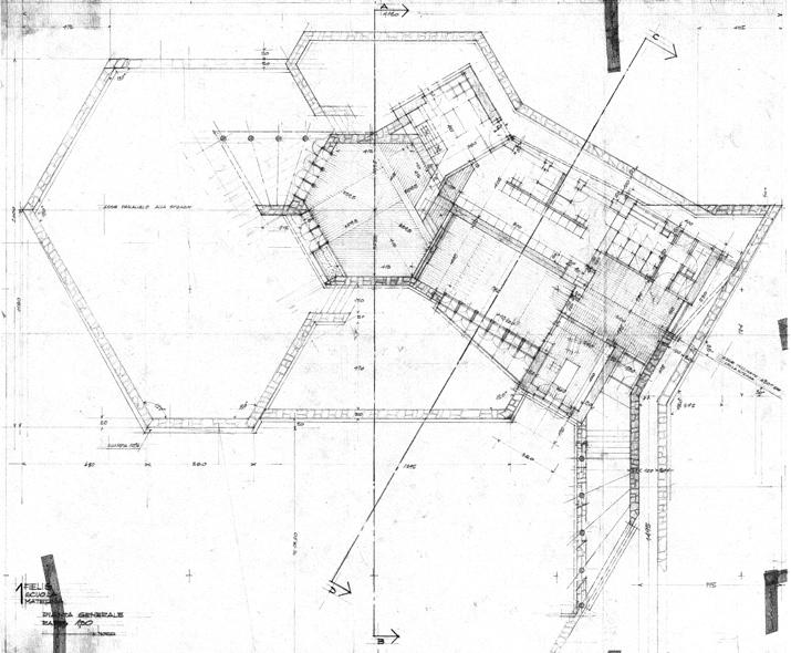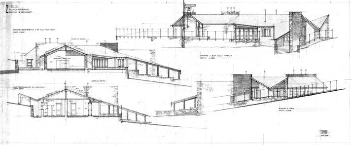 Fielis: pianta, sezione AB sul refettorio, sezione CD su spogliatoi e aula, prospetti della scuola