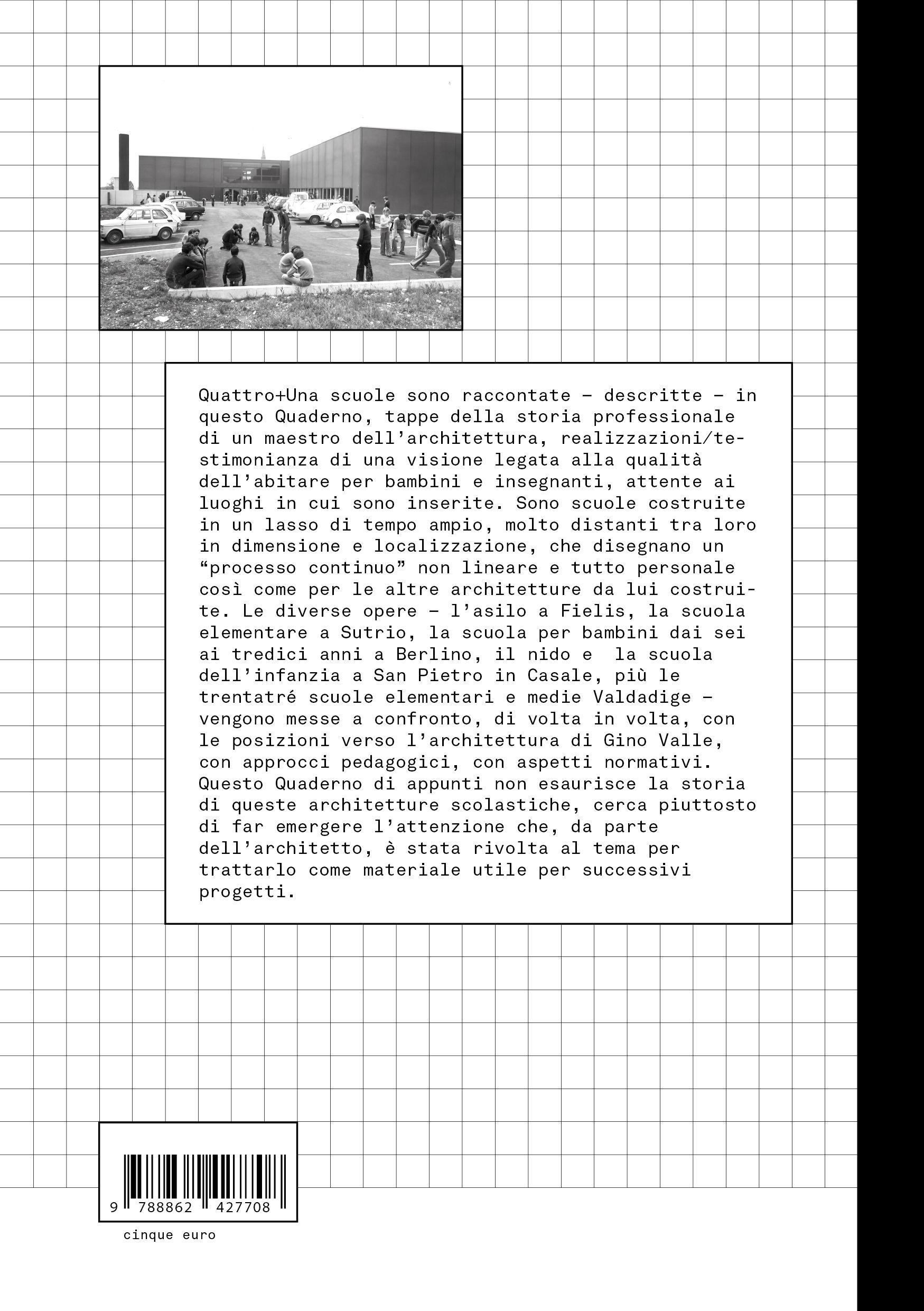 >Questo Quaderno raccoglie le scuole costruite da Gino Valle. Rappresentano tutte dei momenti significativi in ambito architettonico prima e dopo l’esperienza centrale delle scuole Valdadige. Le elementari e medie Valdadige sono il frutto dell’esercizio compiuto dall’architetto nel campo della prefabbricazione in occasione della costruzione di diversi edifici industriali per una committenza italiana illuminata, di nuovi vincoli normativi ma anche di una idea di sviluppo diffusa in Italia negli anni Settanta legata al progresso tecnologico, nonché dell’istruzione di massa. L’osservazione delle scuole Valdadige qui riportata, prodotto dell’analisi della documentazione gentilmente fornita dall’architetto Giorgio Macola –coprogettista assieme a Valle del gruppo di scuole diffuse nel nord Italia – e da Pietro Valle, mette in evidenza principalmente l’idea che lo spazio, la luce e il rapporto con il luogo, abbiano un valore centrale nel progetto di questi ambienti scolastici.