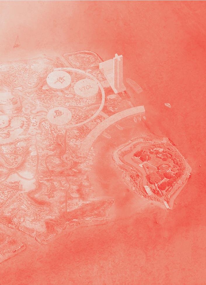 The vertiport is an infrastructure, a landscape, and a place of sea-air interchange. Design by Alessandro Rocca, Giulia Setti, Gino Baldi.