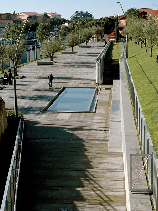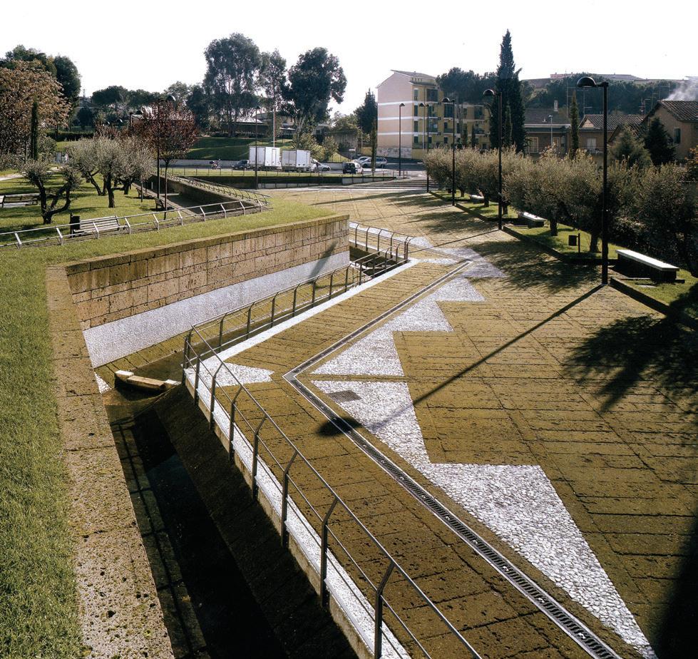 La via del levare: L’area di progetto s’incunea tra gli ultimi brandelli d’agro romano sottratti all’edificazione. Il parco intende, mediante interventi di scavo e rimodellazione dei suoli, ripristinare l’orografia originaria dell’area, offrendo aperture visive sul paesaggio della campagna tiburtina.