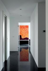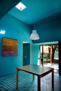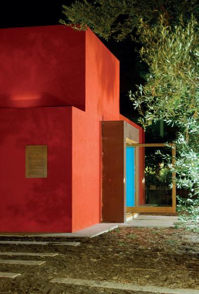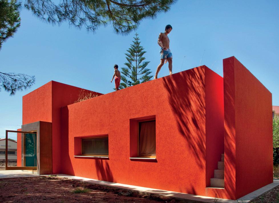 Lo stereometrico volume color aragosta denota una sensazione di solarità in contrasto con la densa penombra dello spazio centrale interno della zona giorno che, con la sua maggiore altezza, riscatta le dimensioni minime della costruzione. Un calibrato uso della luce zenitale qualifica lo spazio domestico con dispositivi cromatici e tattili – il colore turchese, il pavimento in tessere di vetro – che amplificano il contrasto tra l’esterno e l’interno, generando un’atmosfera intensa.