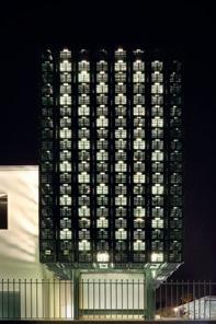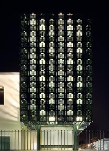 Il nuovo corpo, attraverso il suo cromatismo e l’illuminazione, ha assunto così il ruolo di segnale e di simbolo riconoscibile a distanza nell’anonimo paesaggio urbano circostante. Questo progetto, da un lato, è l’avanzamento di una ricerca, ormai decennale, sul riutilizzo delle cassette di plastica come materiale da costruzione per l’architettura, dall’altro rappresenta un modo per mettere al centro la forma e l’ornamento dell’architettura come potente strumento di promozione di azioni sociali di grande valore. Questa facciata nobilita materiali poveri trasformandoli attraverso il disegno e la tessitura in un potente segnale estetico e identitario.