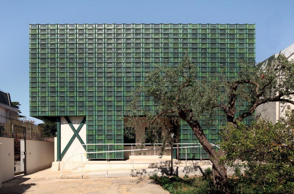 Il riuso di due ex capannoni artigianali è l’occasione per segnare un contesto urbano anonimo e degradato attraverso il potere e la forza dell’Architettura che si serve di materiali grezzi rendendoli fortemente espressivi. Il programma prevedeva il riutilizzo di due edifici per attività di riabilitazione e formazione. Il nuovo corpo ha una struttura in acciaio e un rivestimento realizzato con le cassette di plastica per la raccolta delle arance di due tonalità di verde. Questo corpo si è trasformato in una nuova grande facciata caratterizzata da una pelle di cassette che compongono i pixel di una tessitura con una trama disegnata da linee diagonali parallele di un verde chiaro.