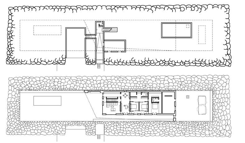 Il progetto prende forma dalla relazione con il paesaggio attraverso la composizione di volumi elementari ai quali è assegnato, con l’uso di diverse materie, il compito di rappresentare i luoghi dell’abitare. Muri di pietra, intonaco e legno sono i materiali che raccontano già nella composizione dei volumi la presenza dei diversi luoghi della casa. In basso, a coincidere con un idea di basamento o giacitura, la pietra misura il rapporto della casa con il suolo in pendenza, scavando stanze nella roccia o emergendo dalla pendenza con un paramento murario sul quale si appoggiano i volumi della casa. Al di sopra di questo, il muro finestrato così come il tetto inclinato che collega il volume della zona giorno