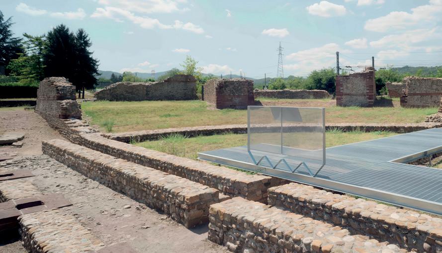 Il progetto, commissionato dalla Soprintendenza per i Beni Archeologici del Piemonte e del Museo Antichità Egizie, ha disegnato una passerella di ferro zincato che ha la doppia funzione di coprire un canale di scarico delle acque, portato a vista dagli scavi, e di fissare l’originaria quota di pavimento del teatro romano. La struttura, montata in opera e collocata su martinetti meccanici a vite che la sollevano alla quota necessaria, rimanda nella sua geometria simmetrica le bonhomme d’Ampère, la sintetica figura umana che rappresenta la regola di elettromagnetica messa a punto nell’Ottocento dal fisico francese.