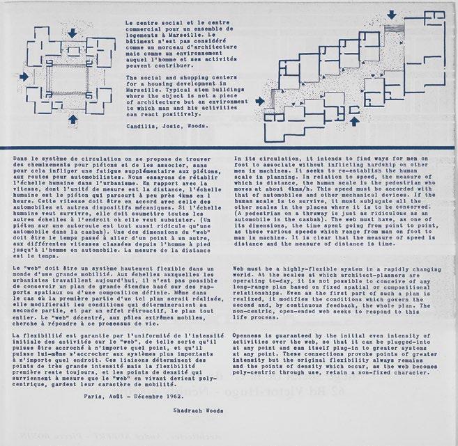 Organizzazione, sistema, struttura non sono ovviamente sinonimi. Ma hanno forti rimandi entro il dibattito internazionale in quegli anni. I passaggi non sono meccanici, ma intuibili. Per l’architettura e la città si ricerca un’organizzazione che sia dinamica, efciente, porti ordine, sia adattabile e comprensibile. A livello urbano e architettonico l’organizzazione è un processo di analisi e interpretazione di dati, al fne di descrivere una strategia spaziale: una conscious practice sostenuta con determinazione fn dall’immediato dopoguerra. Quelle strategie di interpretazione, quell’organizzazione dinamica, si devono poter leggere come un sistema («come una struttura») e si devono poter avvicinare attraverso una forma (concettuale oltre che spaziale). Forma che per Woods, Candilis e Josic prenderà i nomi di stem, web, grid. Nelle pagine di questo libro sono messi bene in rilievo gli sforzi teorici di Woods, il merito individuale e le specifcità della sua rifessione all’interno del sodalizio professionale. Ma anche l’ampia compagnia nella quale egli si ritrova, in quegli anni, nel rivendicare (senza