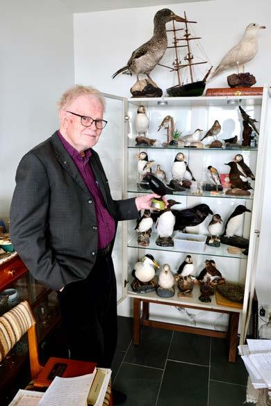 ekki vera mannglöggur en sýnir mér skjöl um fuglana sem hann merkti, uppstoppaða fugla sem honum hafa áskotnast og steingervinga, sem hann hefur fundið í Höfðanum. Í seinna skiptið sem ég heimsæki Óskar býður hann upp á kaffi, hann hefur ekki hellt upp á í hálft ár eða svo, að einhverju leyti vegna Covid fársins. Okkur verður strax vel til vina.
