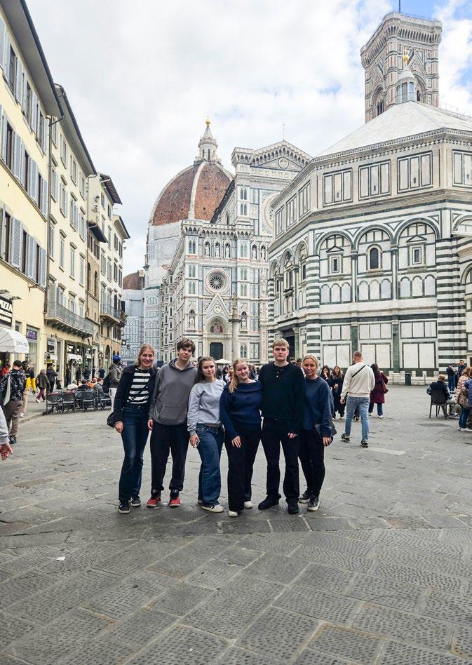 þar sem afrakstur verkefnisins sl. tvö ár var kynntur. Við kennararnir gætum ekki verið stoltari – þau voru kurteis, dugleg, áhugasöm og óhrædd við að taka þátt í öllu sem gert var. Dagarnir voru margir langir og mörgþúsund skref gengin á hverjum degi, en það var auðvitað ekki bara unnið. Hópurinn fékk t.d. fræðslugöngu um eldri borgarhluta Pisa og það var að sjálfsögðu stoppað við hinn fræga skakka turn. Nemendur fengu líka tíma til að njóta borgarinnar á eigin forsendum; kynnast ítalskri menningu og hafa gaman í góðum hópi jafnaldra á meðan kennararnir fóru í skoðunarferð til Lucca. Daginn fyrir heimferð skellti íslenski hópurinn sér í dagsferð til Flórens. Þar fóru nemendur í hestvagnaferð um miðbæinn – sannkallað ævintýri – á meðan kennararnir lögðu í lengri gönguferð „upp fjallið“ til að njóta útsýnisins yfir þessa stórfenglegu borg.