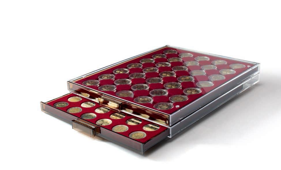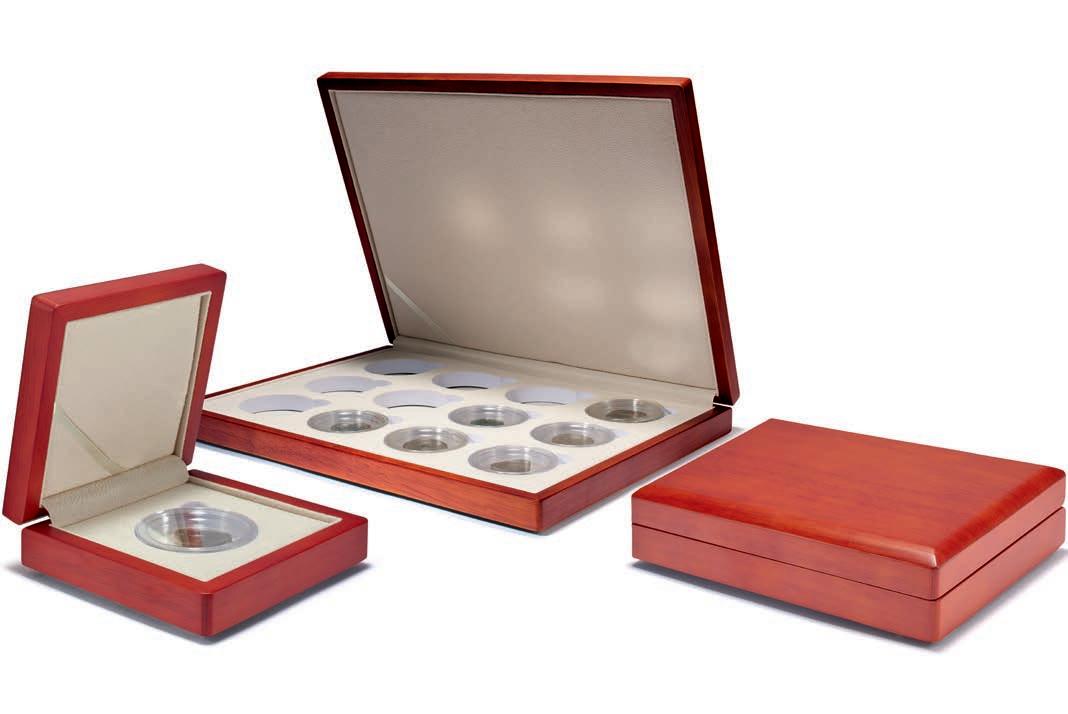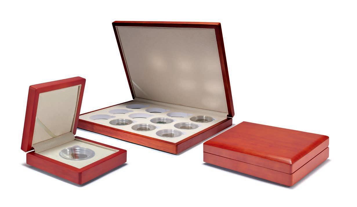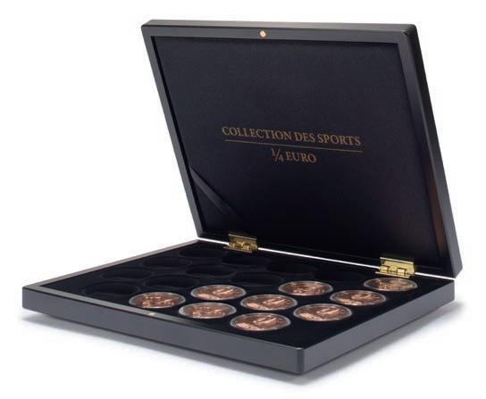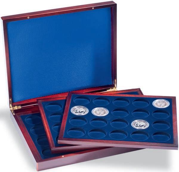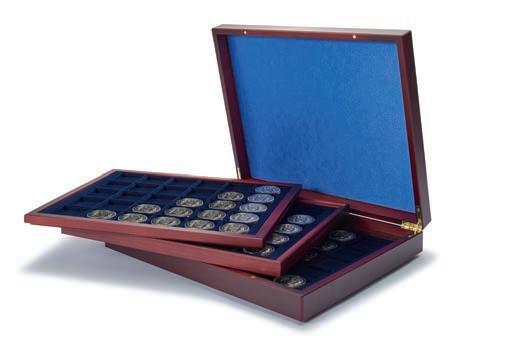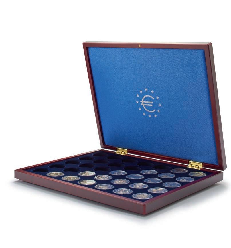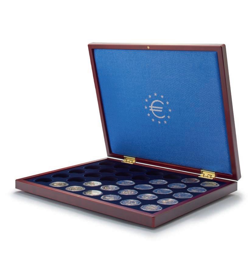 7 Volterra-muntencassette Stevig houten cassette, mahoniekleurig, inlegwerk met fluweelachtig oppervlak en elk tableau voorzien van 35 ronde vakken ( 32 mm), kantelmechanisme voor het uitnemen van munten (capsules niet inbegrepen), bedrukking van hoes en kussen op buitenkant cassette en satijnen binnenkussen, magneetsluiting a 1-laags voor 35× 2-euromunten in capsules