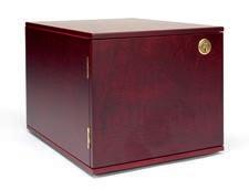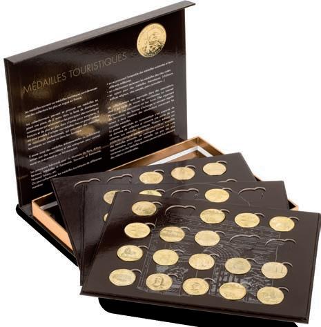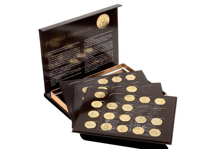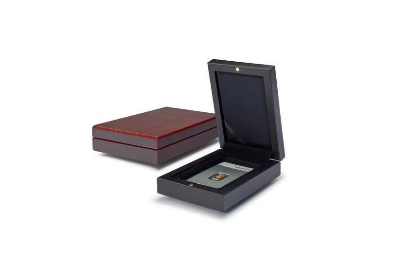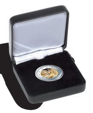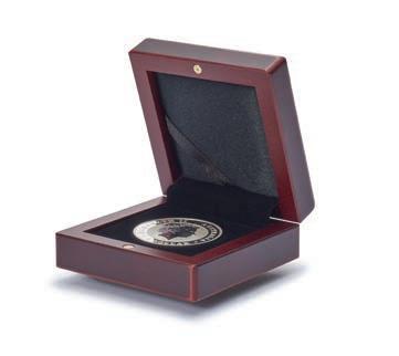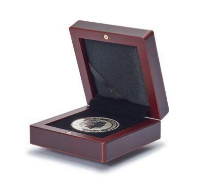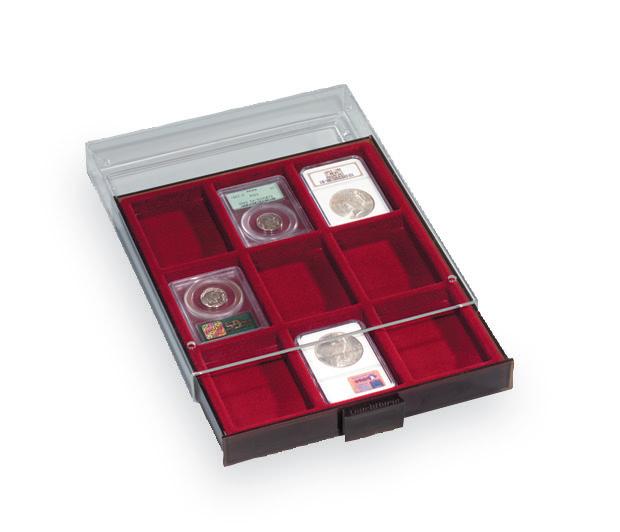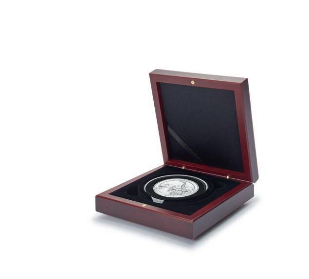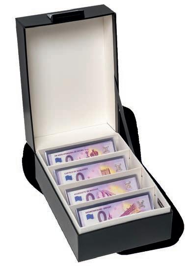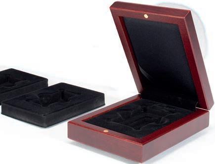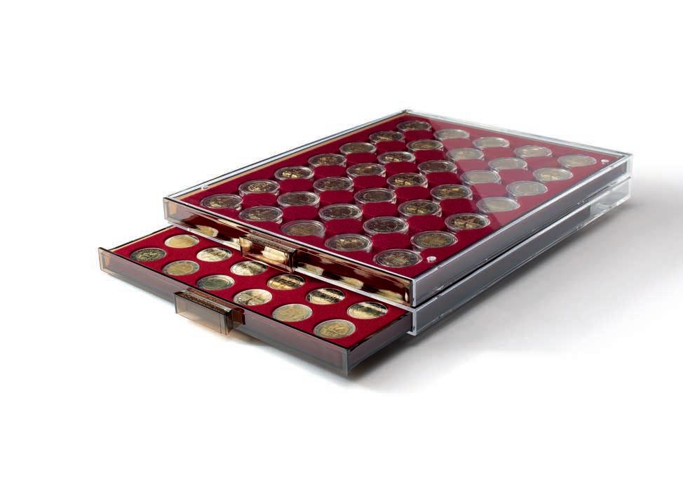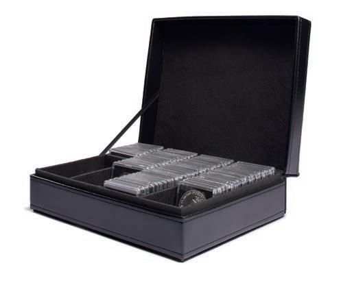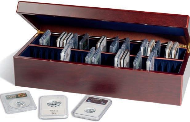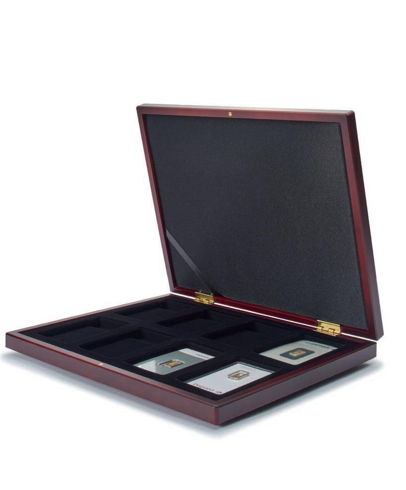 7 Volterra-muntencassette Stevig houten cassette, mahoniekleurig, inlegwerk met fluweelachtig oppervlak en elk tableau voorzien van 35 ronde vakken ( 32 mm), kantelmechanisme voor het uitnemen van munten (capsules niet inbegrepen), bedrukking van hoes en kussen op buitenkant cassette en satijnen binnenkussen, magneetsluiting a 1-laags voor 35× 2-euromunten in capsules