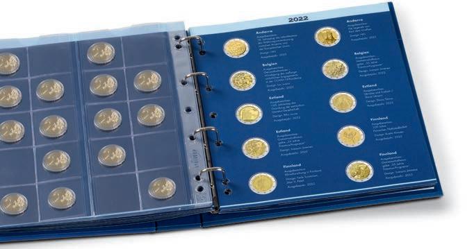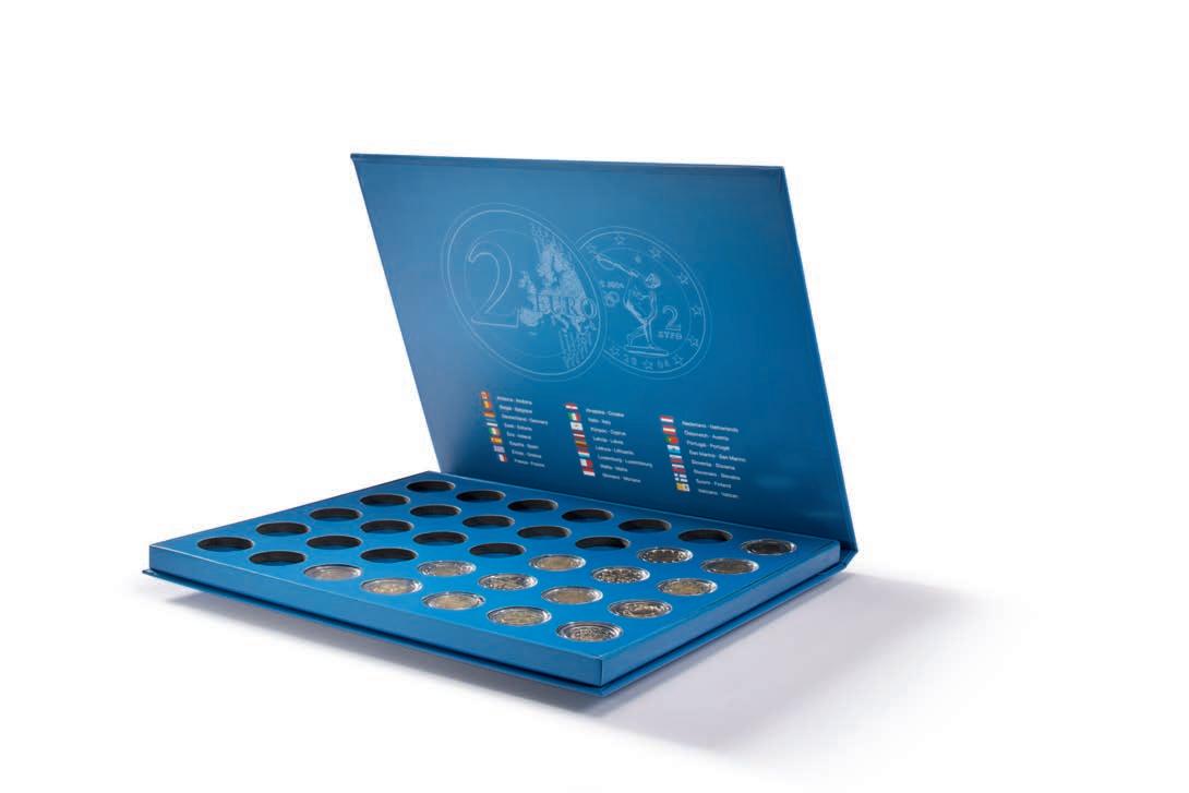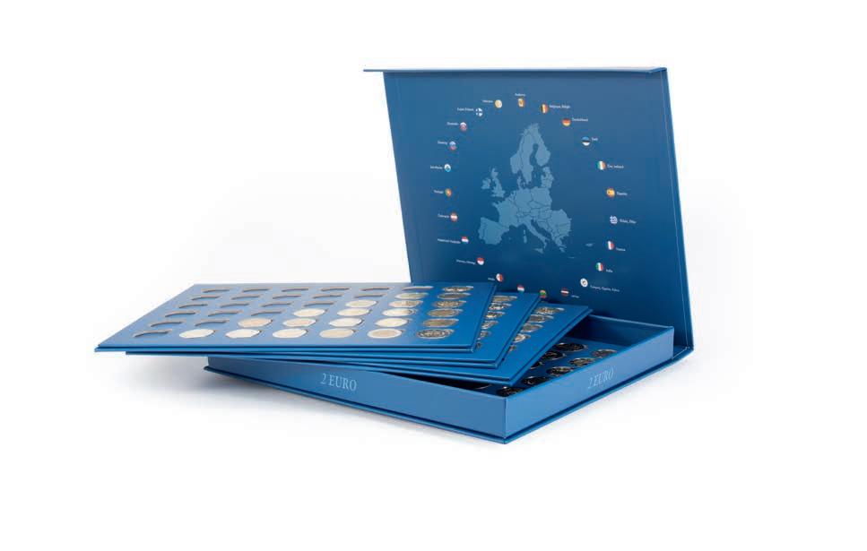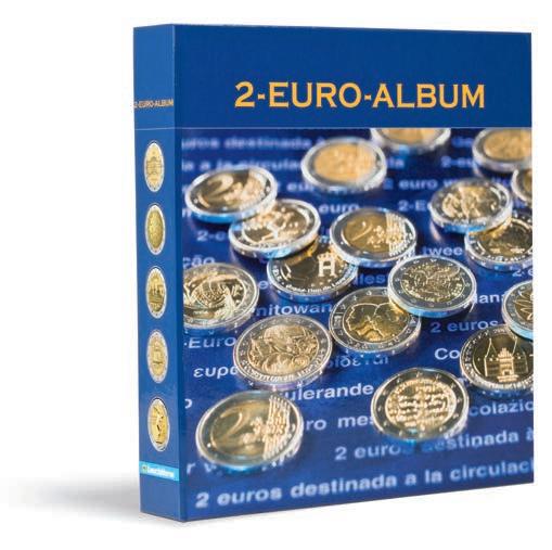 Met 6 vast ingebonden muntbladen voor maximaal 48× 2-euromunten, weekmakervrije vakjes van hard pvc, reliëfdruk op de cover
