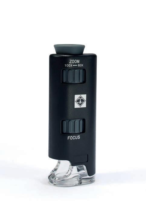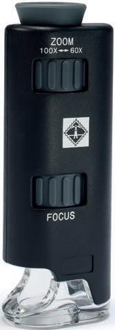 Z akmicroscoop , variabele instelling tussen 60- en 100-voudige vergroting, dankzij de ledverlichting ook te gebruiken bij slecht licht, behuizing van zwarte kunststof