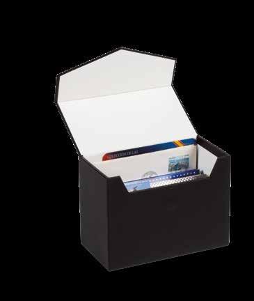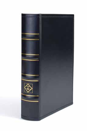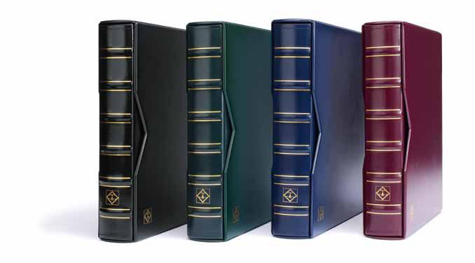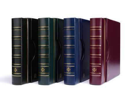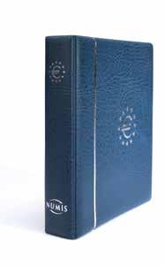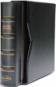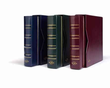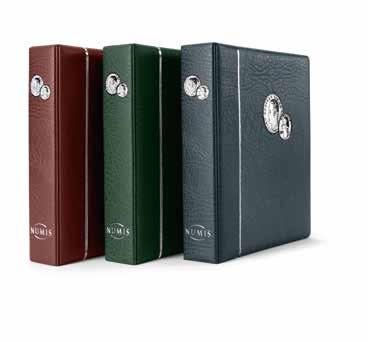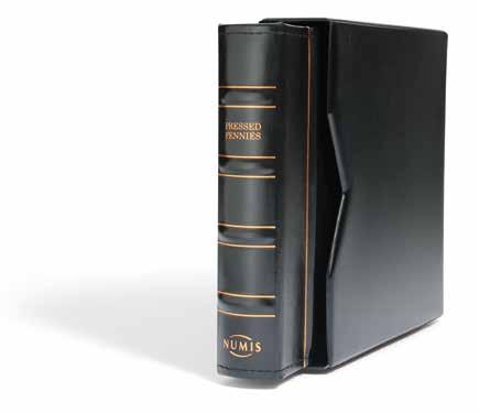 Desky z umělé kůže, až na 15 obálek, čtyřkroužkový mechanismus, včetně ochranné kazety a 5 obalů Numis (Výr. 33 85 71), vhodné pro lisované mince (Pressed Pennies) ve svislém i vodorovném formátu, včetně 5 bílých prokládacích listů