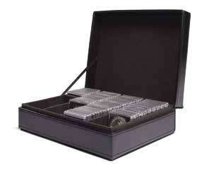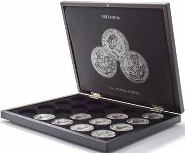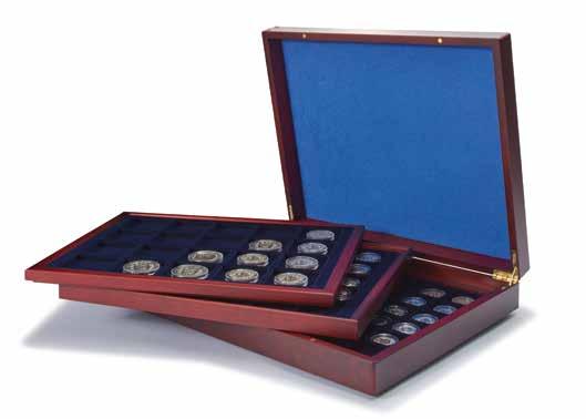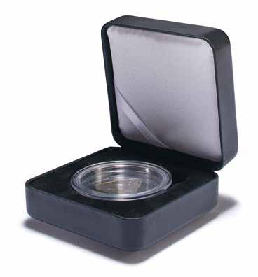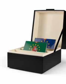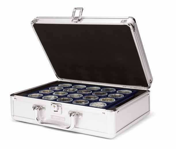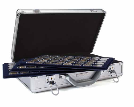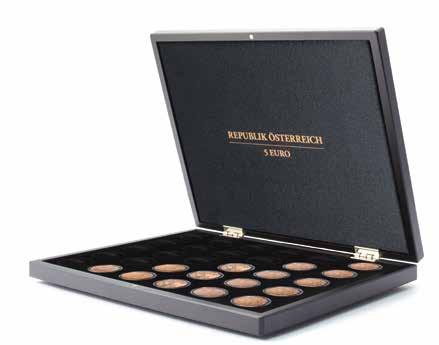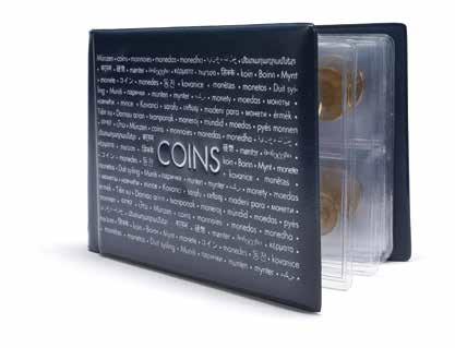 Pojme až 180 dvoueurových mincí nebo 9 mincovních listů Vista, koženkový obal s ražbou na víku i hřbetu, vhodné pro všechny mincovní listy Vista nebo mincovní pouzdra Optima