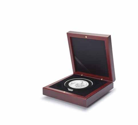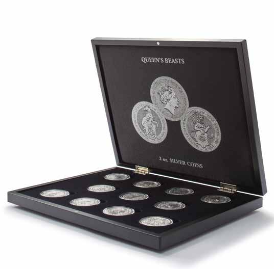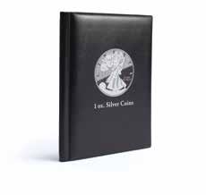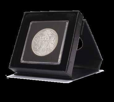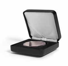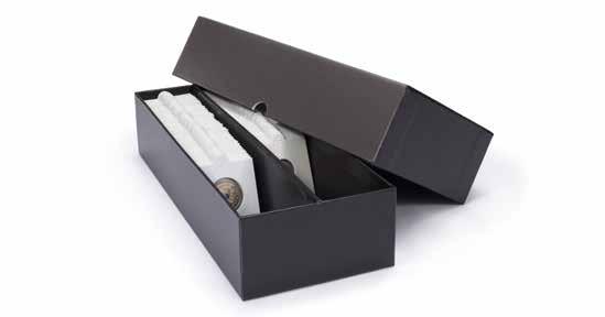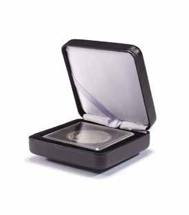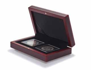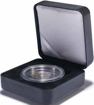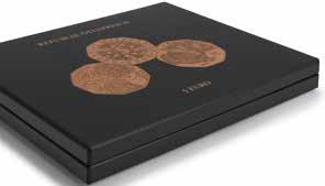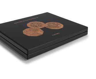 Obsah: 8 pevně svázaných obálek na mince s vložkami tvrdého PVC bez změkčovadel každá na 12 mincí 33 mm, polstrované desky v černé barvě s ražbou víka v měděném odstínu