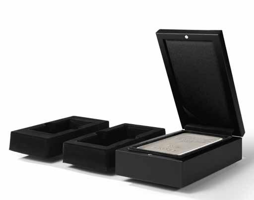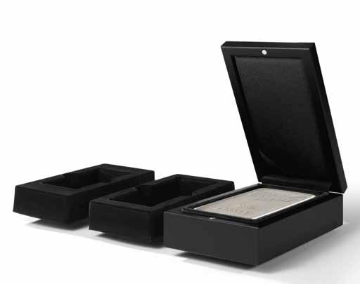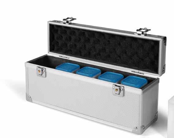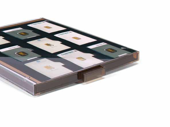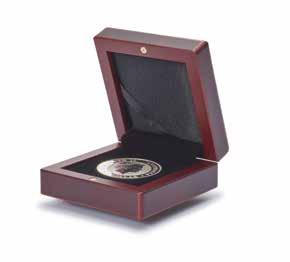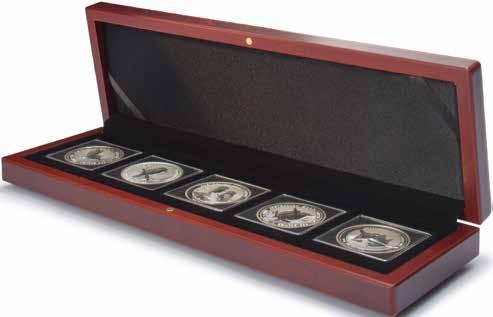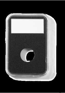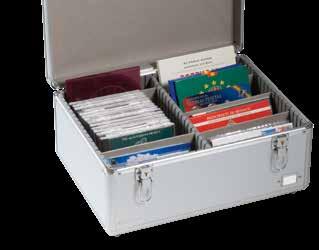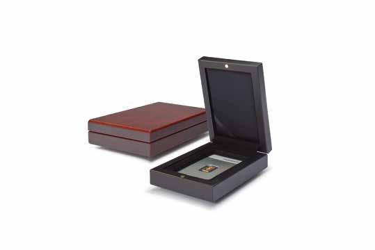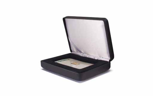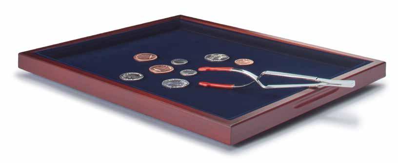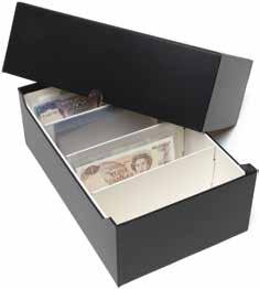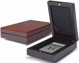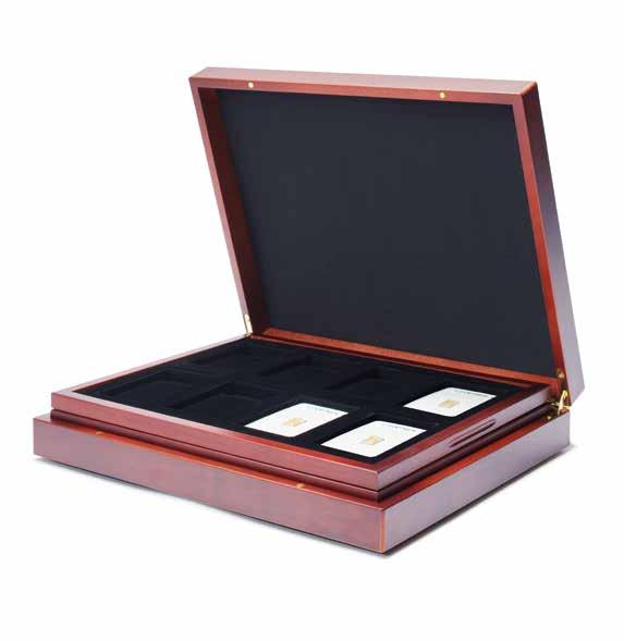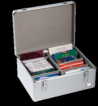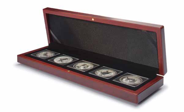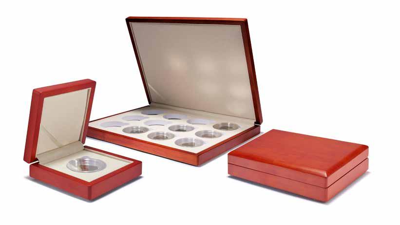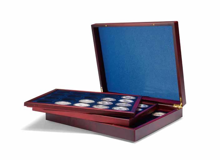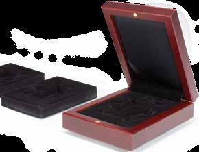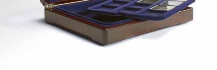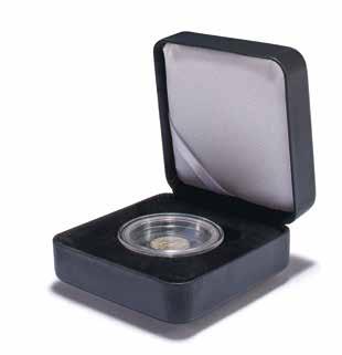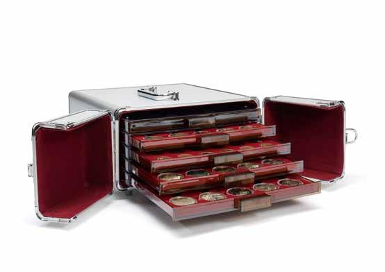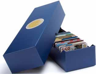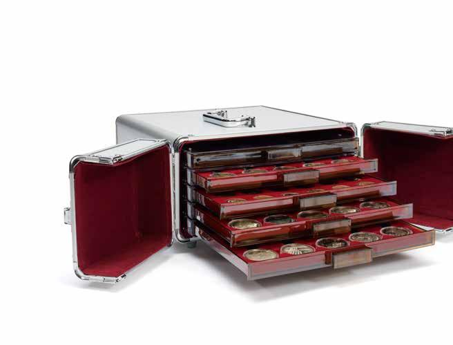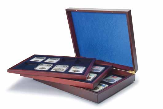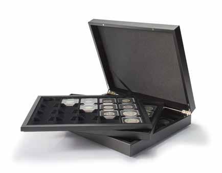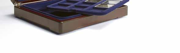 Pro max. 9 ražených zlatých blistrů, kouřová barva, sametová vložka, stohovatelné a kombinovatelné s dalšími mincovními schránkami MB, vhodné pro většinu bankovních bezpečnostních schránek