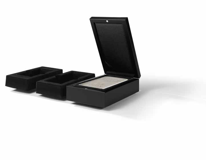For gold bars in blister packaging For up to 9 embossed gold bar blisters, smoke-coloured, velvety inlay, stackable and compatible with other MB coin boxes, suitable for most bank safe deposit boxes