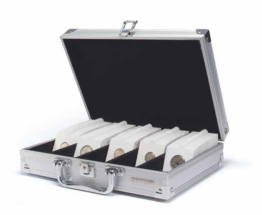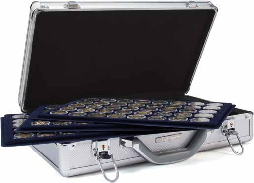 Incl. 6 trays for 40 coins up to 33 mm each (capsules not included), padded lid, black velour lining, lockable (2 keys), metal corner fittings