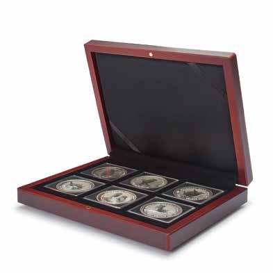 7 Volterra coin presentation case Sturdy wooden frame, mahogany style, inlays with a mock-velour surface and 35 round compartments ( 32 mm), tilt mechanism for easy coin removal (Grips or Ultra, not included), printed lid and inlay, magnetic closure