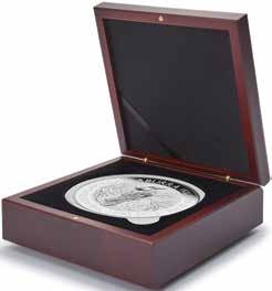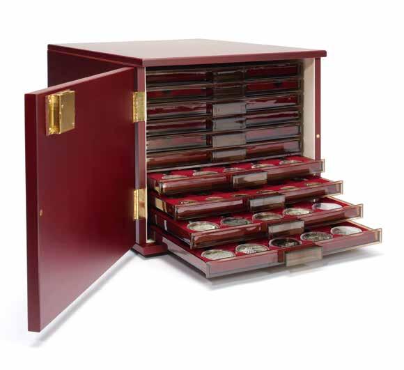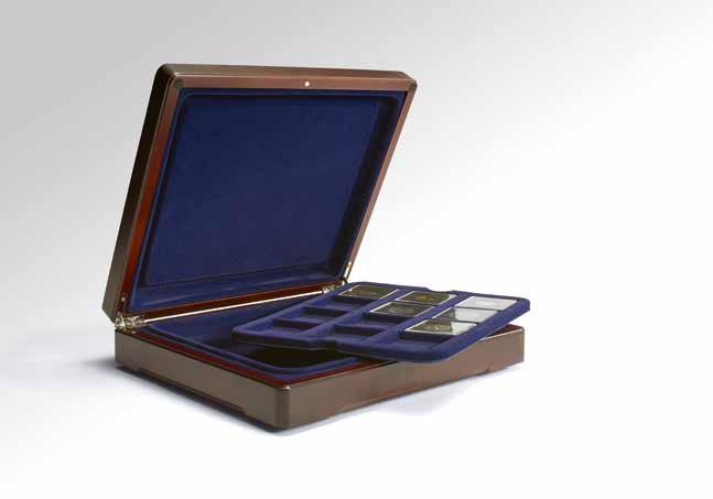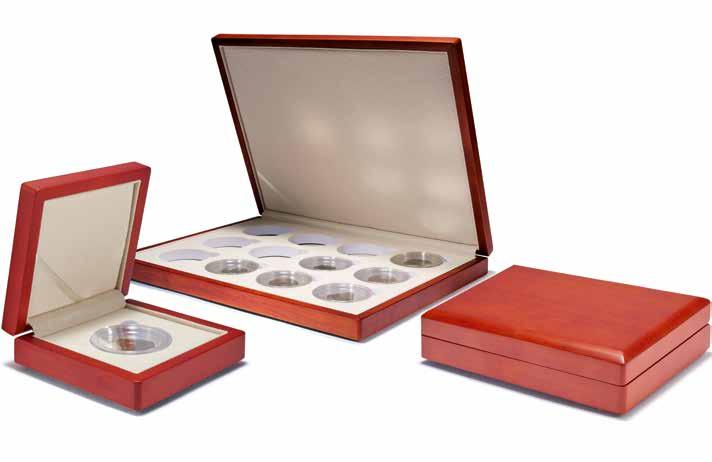 Stevig houten cassette, mahoniekleurig, inlegwerk met fluweelachtig oppervlak en elk tableau voorzien van 35 ronde vakken ( 32 mm), kantelmechanisme voor het uitnemen van munten (capsules niet inbegrepen), bedrukking van hoes en kussen op buitenkant cassette en satijnen binnenkussen, magneetsluiting