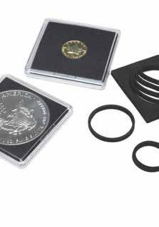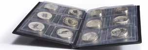 Inhoud: 8 harde munthulzen met weekmakervrij hard pvc slots voor 12 munten elk tot 33 mm diameter, gewatteerde omslag in zwart met koperkleurige reliëfdruk op de omslag