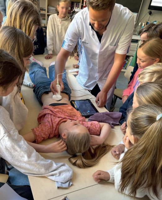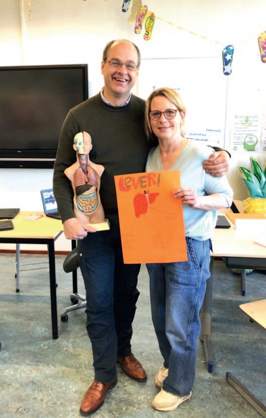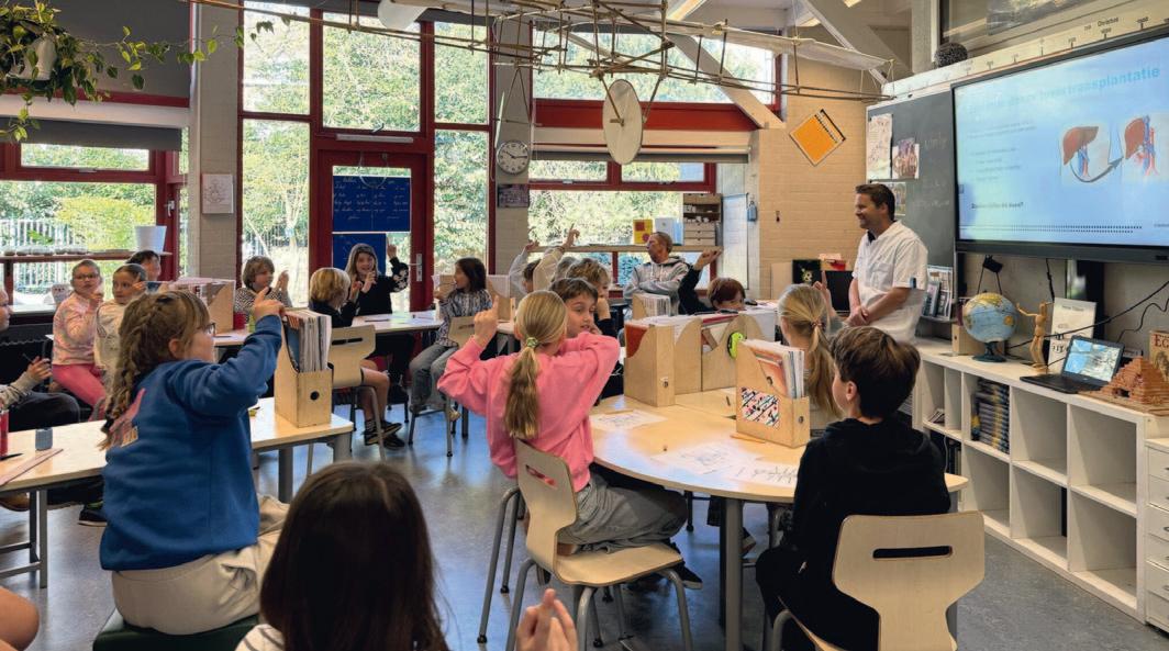 ‘Wij zijn de dokters die de hele dag over poep praten’, introduceert maag-lever-darmarts Bart Takkenberg uit het Amsterdam UMC zichzelf en zijn collega Hanneke van Soest van het Haaglanden MC. Zij zijn te gast bij groep 8 van de Beatrixschool in Huizen. Dit bezoek is onderdeel van een reeks gastlessen die een aantal Nederlandse leverartsen tussen maart en juni als randprogramma van het International Liver Congres 2025 op verschillende scholen door Nederland hebben gegeven.