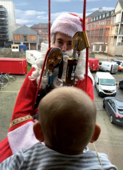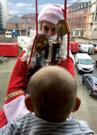 zijn we mee begonnen na de eerste operatie, zodat Adri later zijn eigen verhaal achter zijn littekens kan vertellen. Het is een drukke ochtend met veel verplegers die ons sterkte wensen bij het afscheid. De rit in de ambulance is gezellig en voor we het weten zijn we in Groningen. Eenmaal op de afdeling worden we met open armen ontvangen. Al snel staan er oude bekenden om ons heen. De verpleegkundigen zijn nieuwsgierig hoe het gaat en of Adri is gegroeid. Hij geniet zichtbaar van alle aandacht en ik zie een vlaag van herkenning op zijn gezichtje. Bij het raam op zijn kamer hangt een touw naar beneden. Vanwege kerst komen de glazenwassers als kerstmannen abseilen en bij het raam spelletjes doen met de kinderen. Adri vindt het wachten voor het raam lang duren, maar ineens zakt er iemand in een kerstmannenpak naar beneden. Na een kort spelletje tegen het raam aan tekent de kerstman een