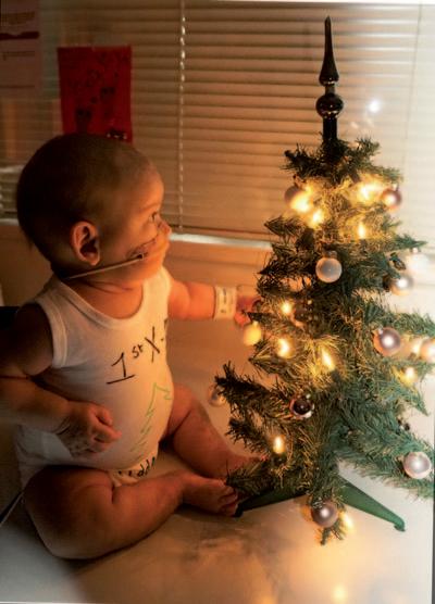 had ik Adri hier graag bij gehad. Stilletjes komen bij mij de tranen. De volgende morgen doe ik de mooiste kleren aan die ik heb meegenomen. Ondanks alles willen we toch het gevoel van een feestdag hebben. Als ik de kamerdeur opendoe valt er bijna een cadeaupakket om. Wat een verrassing! Tijdens Adri’s slaapje wordt er ook nog eens een Kikabeer neergezet. Alsof dat nog niet genoeg is, gaan de verpleegkundigen een kerstkaart en kerstromper met hem maken en krijgt hij eigen kerstlichtjes cadeau voor aan zijn bed. Wat een verwennerij! Aan het einde van de dag ben ik nog aan het nagenieten van deze fijne dag. Ineens staat Ane op en komt even later in pak terug. Hij geeft mij een doos heerlijke chocolade en een brief. Nog voor ik de brief uit heb, zit Ane op zijn knieën voor