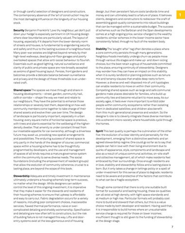 design, but their persistent failure costs landlords time and money and can ultimately lead to a failure of place. It behoves clients, designers and constructors to rediscover the craft of assembling good-quality components into robust buildings that can be managed within a sustainable budget. The success of schemes such as the Barbican and the Span developments comes at a high ongoing price, service-charged to the wealthy residents; similar schemes in the lower-income sector have consistently failed, through no fault of the resident body. Stability The ‘sought-after’ tag often denotes a place where a core community persists through many generations. Neighbourhoods inevitably undergo churn as people move through various life stages and make up- and down-sizing choices, but the best retain a group of households committed to the place, ensuring continuity of stewardship. Designers may wonder how they can have an impact on this stability, when it is surely landlord or planning policies such as tenure mix and tenancy clauses that enable deep roots to form. However, a diverse and well-disposed mix of unit typologies can enable residents to move on within their community. Compelling shared spaces such as large and safe communal gardens make places desirable for families, who build up community ties and become reluctant to move away. As our society ages, it feels ever more important to enfold older people within community ecosystems rather than isolating them in dedicated satellites; and children also benefit from this multi-generational presence and wisdom. So the designer’s role is to cleverly integrate these diverse members into a coherent micro-society where households cycle through the homes. Spirit This last quality is perhaps the culmination of the other five: the evolution of a clear identity and personality for the development, emerging from a distinctive aesthetic and an agreed stewardship regime. One could go so far as to say that people can fall in love with their living environment due to quirks of appearance, style, components and landscape and also as a result of unique communal activities, on-site staff and collective management, all of which make residents feel embraced by their surroundings. Once enough residents are in love, stability and stewardship follow and a lasting place is born. But it only takes a change in lettings policy or a spell of under-investment for this sense of place to degrade; residents need to be aware and protective of the factors that contribute to what can be a fragile ecosystem. Though some contend that there is only one suitable built format for successful and lasting housing, these six qualities can all exist at high density, with tight space standards and at medium or high rise. Particular formats will probably cost more to build and steward than others, but this is a value choice made by both developer and resident. Having said that, it is irresponsible to build homes where an unsustainable service charge is required for those on lower incomes; insufficient thought is still given to the funding of stewardship at the design stage. 7