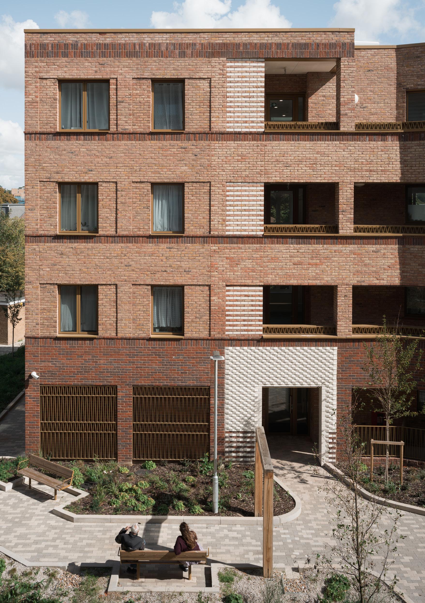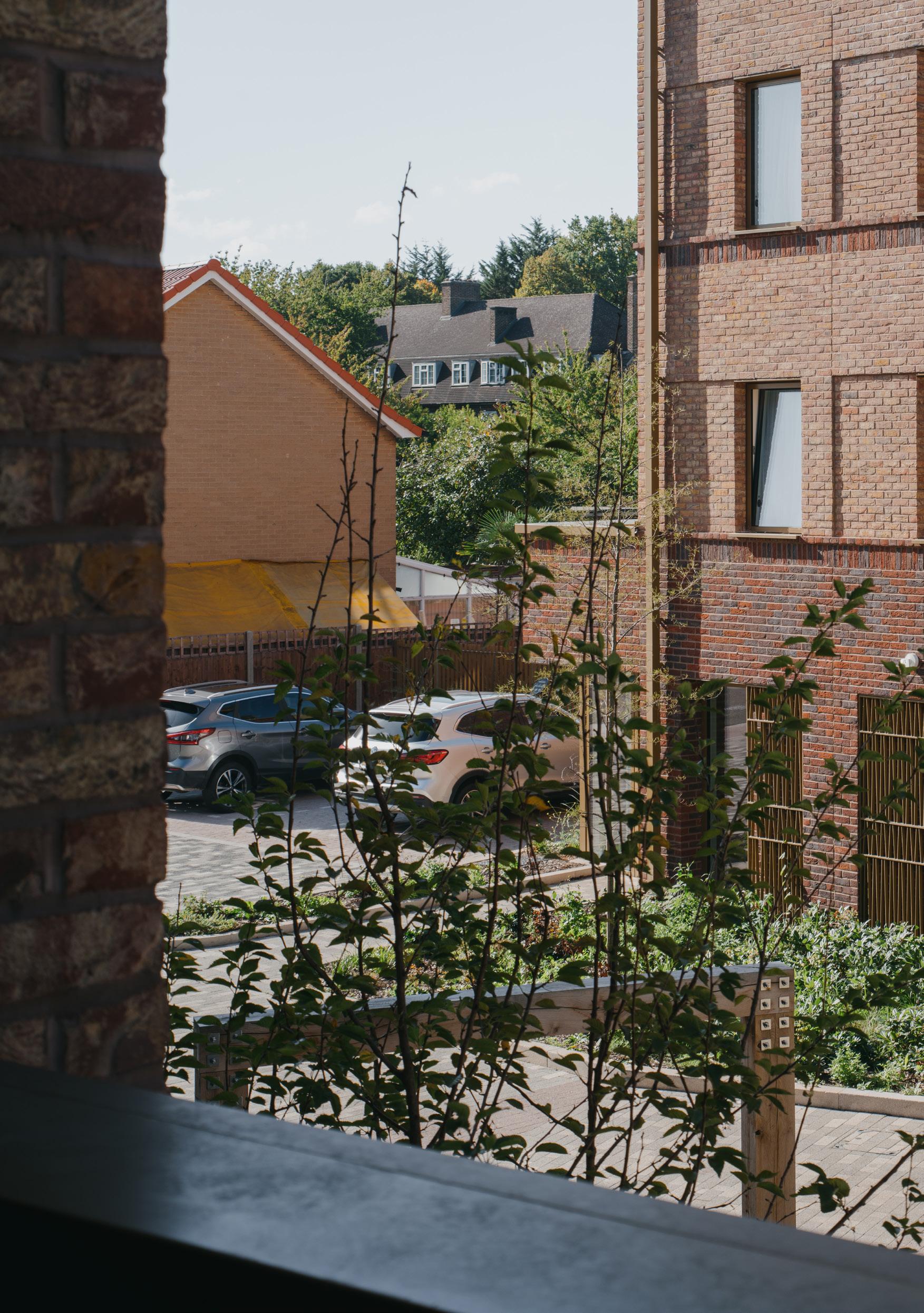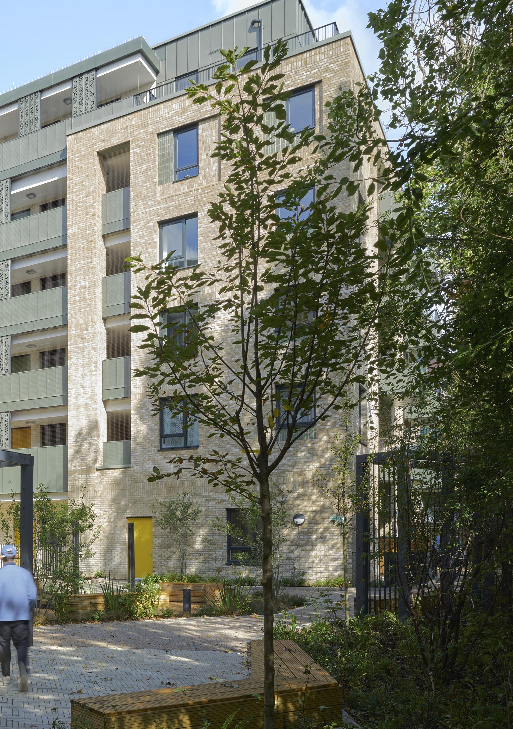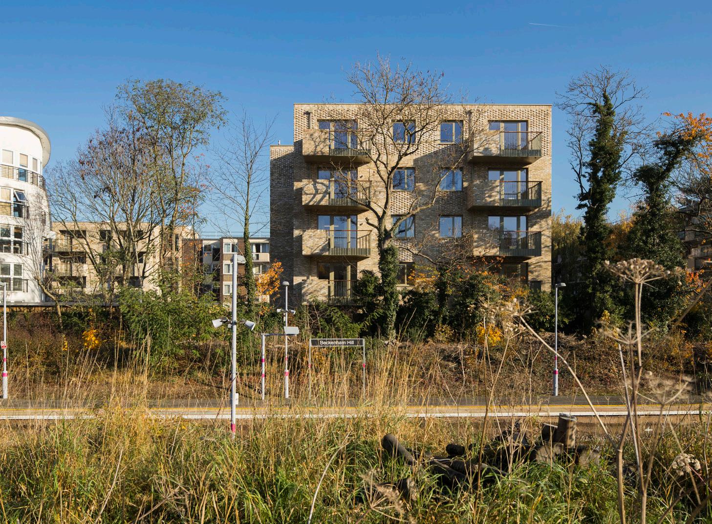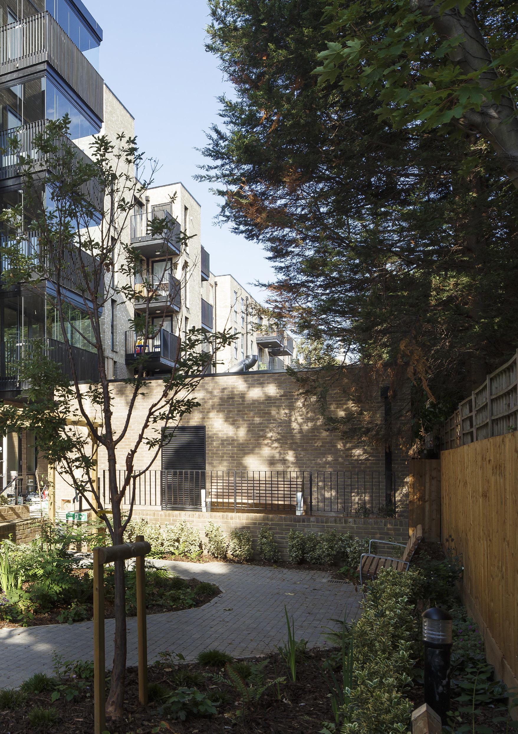 The two subtly cranked buildings partially enclose a pedestrian-prioritised central green space which retains public routes through the site to Beckenham Hill Station. A south-facing ‘garden room’ wraps around into the protected garden for residents and visitors.